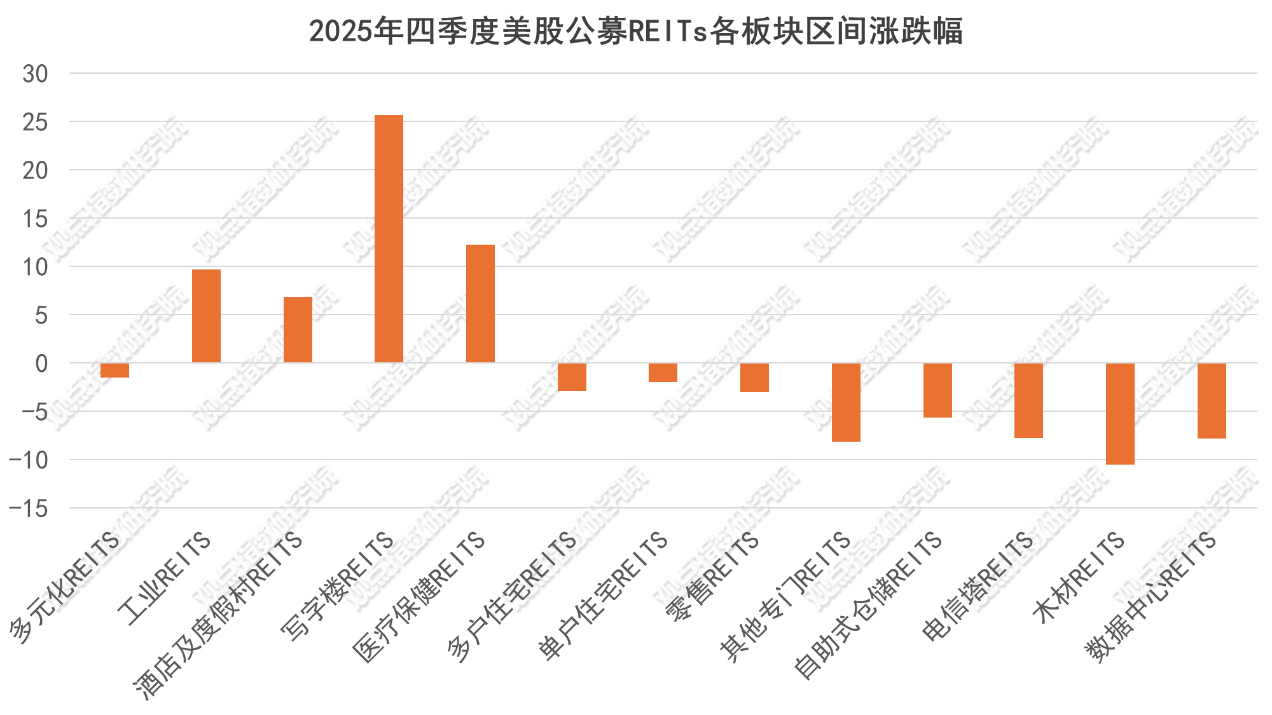 核心支撑在于已公布的2025年第三季度业绩显示,整体REITs公司收入及利润增速均好于市场预期,其中办公REITs盈利相对明显,强化了市场对这两个板块的价值认可。反观下跌板块,自助式仓储REITS受关税影响跌幅达5.69%,多元化REITs多户住宅REITs、零售REITs分别下跌1.53%、2.88%、3.04%,此外电信塔REITs、数据中心REITs等板块也呈现不同程度的下行。