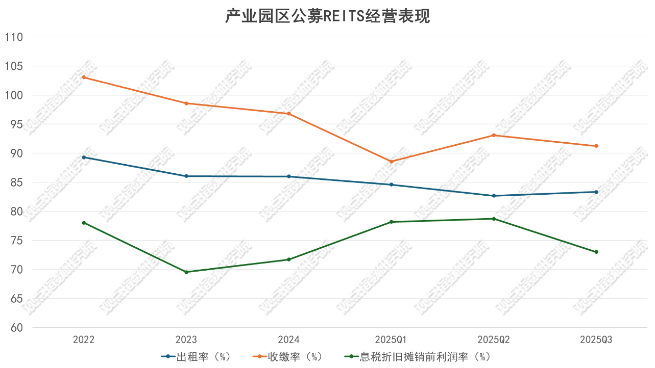 产业园区公募REITs经营表现呈现“出租率稳中微降、收缴率梯度回落、利润率先抑后扬”的分化特征。