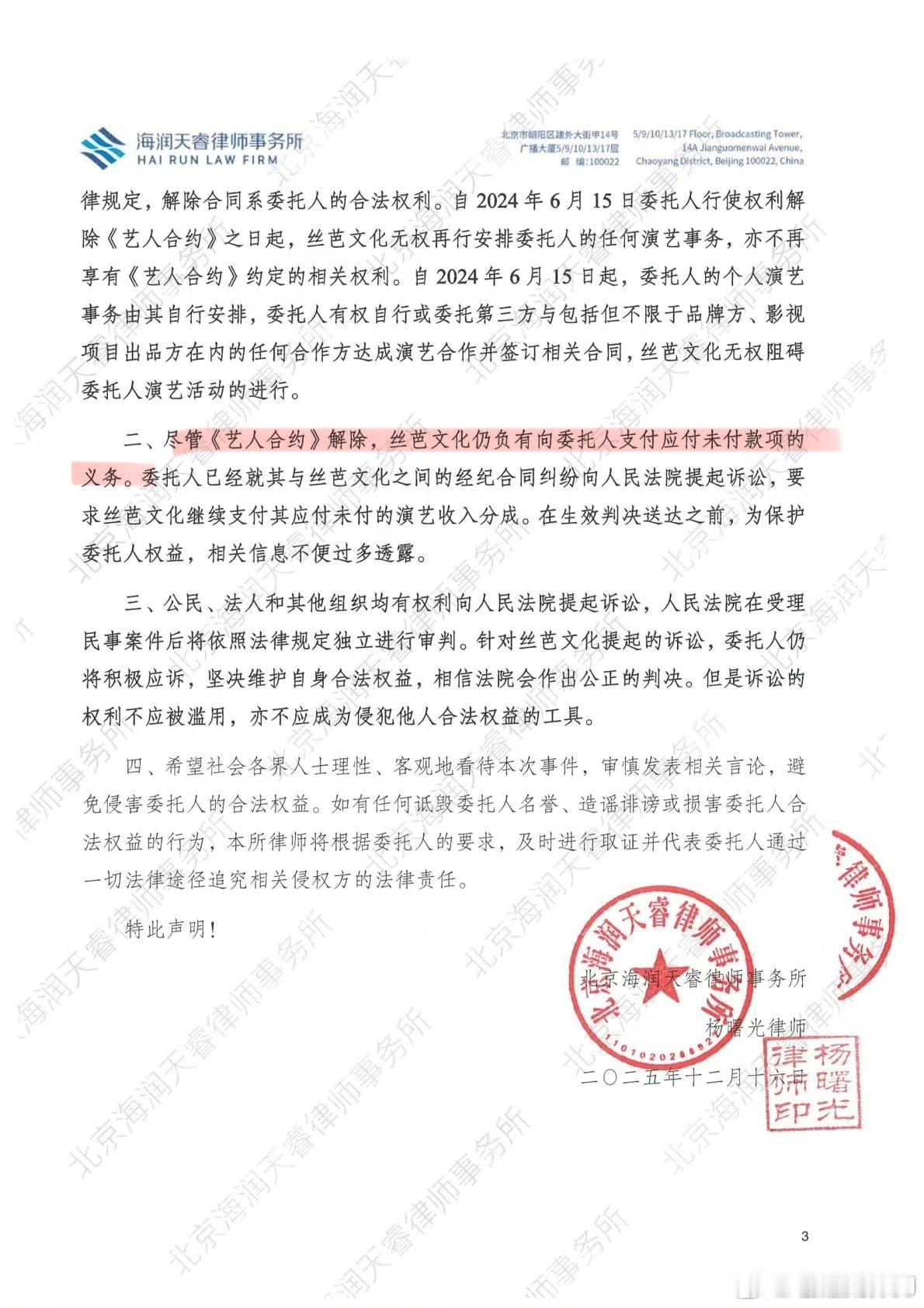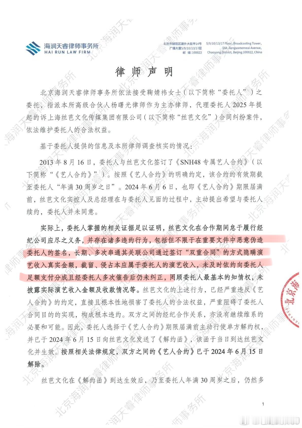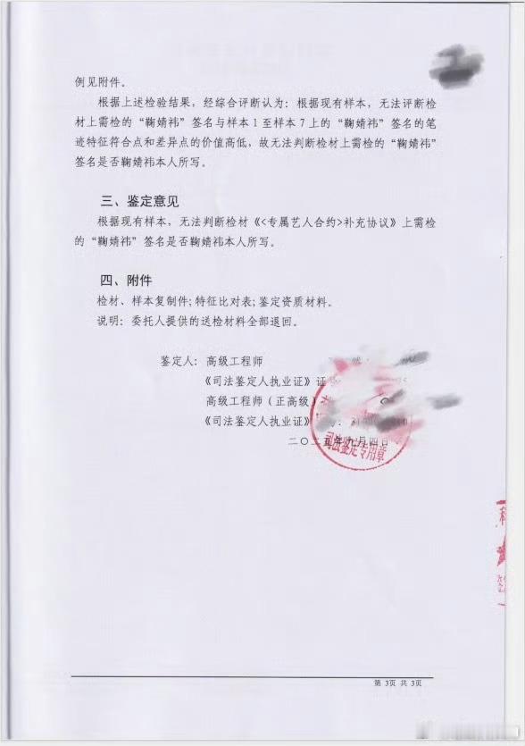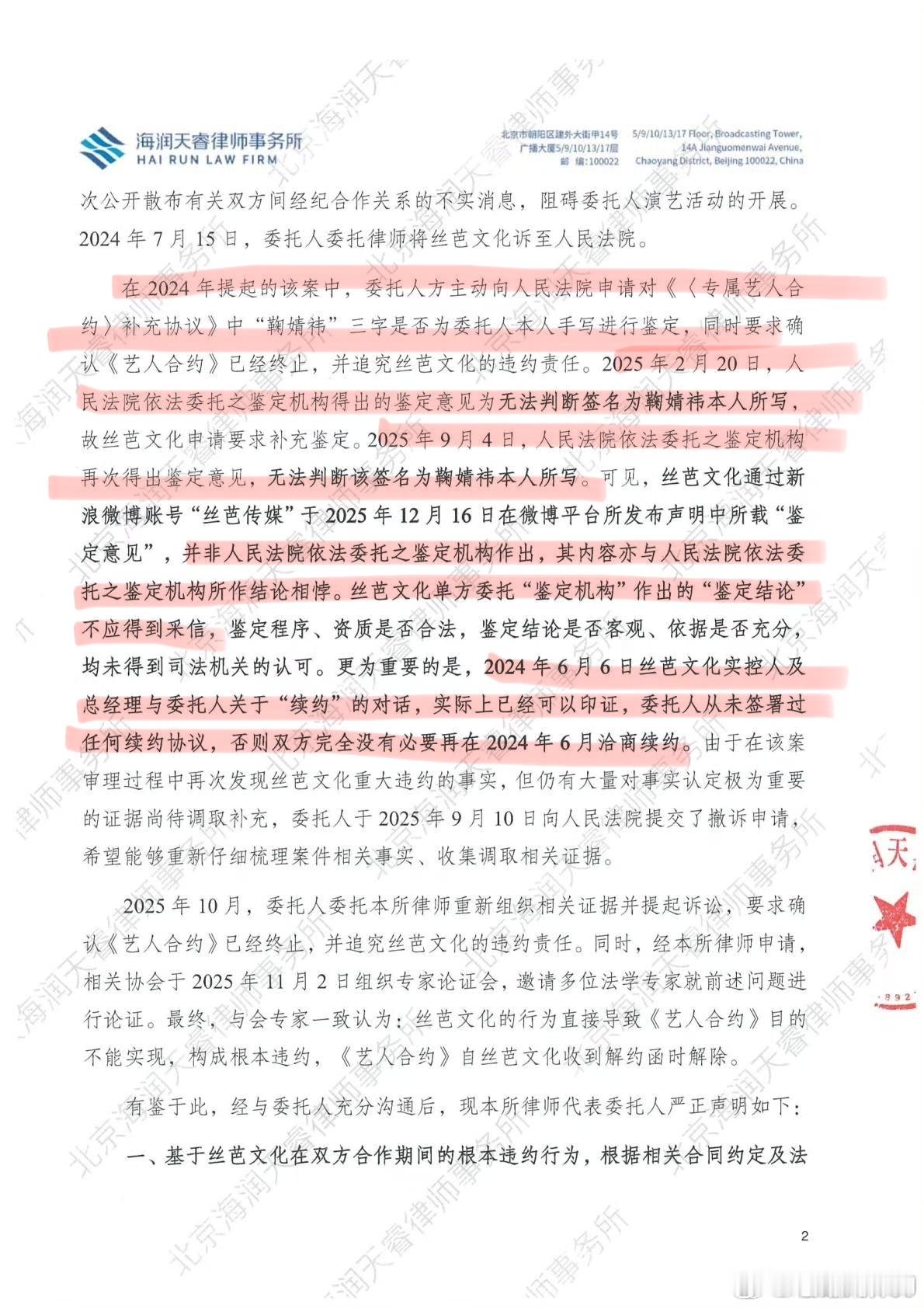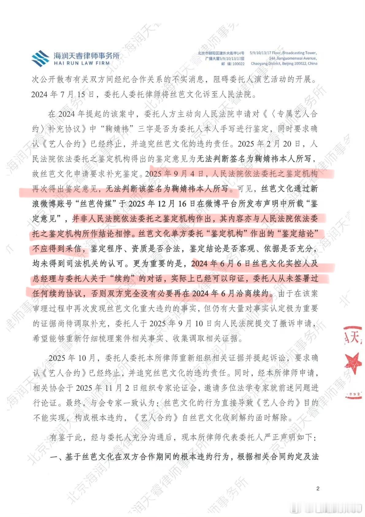 鞠婧祎的委托律师对丝芭刚刚发布的笔迹鉴定结果做出了回应:鞠婧祎主动申请做笔迹鉴定,法院委托专业机构两度鉴定,结果都是“无法判断签名系鞠婧祎本人所写”。丝芭发的鉴定结果是他们自己找的、未经司法认可的第三方机构所出,合约到期前丝芭方面约鞠婧祎谈续约也可以说明双方从未有过继续合约的共识,鞠婧祎也没有签过任何续约协议。最后律师声明还催了一下丝芭,约虽已满,还请不要欠款。