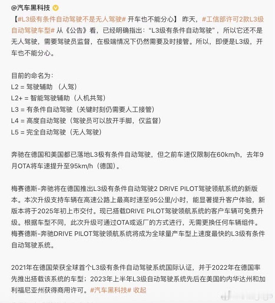 首批L3级车辆真来了!将首先以网约车、专车或租赁车的形式出现在特定区域,由受过专业培训的商业机构运营。工信部发布了长安深蓝SL03和极狐阿尔法S成为首批获得国家级“准生证”的量产车型。值得注意的是,L3还是有条件的自动驾驶,目前还不是“无人驾驶”