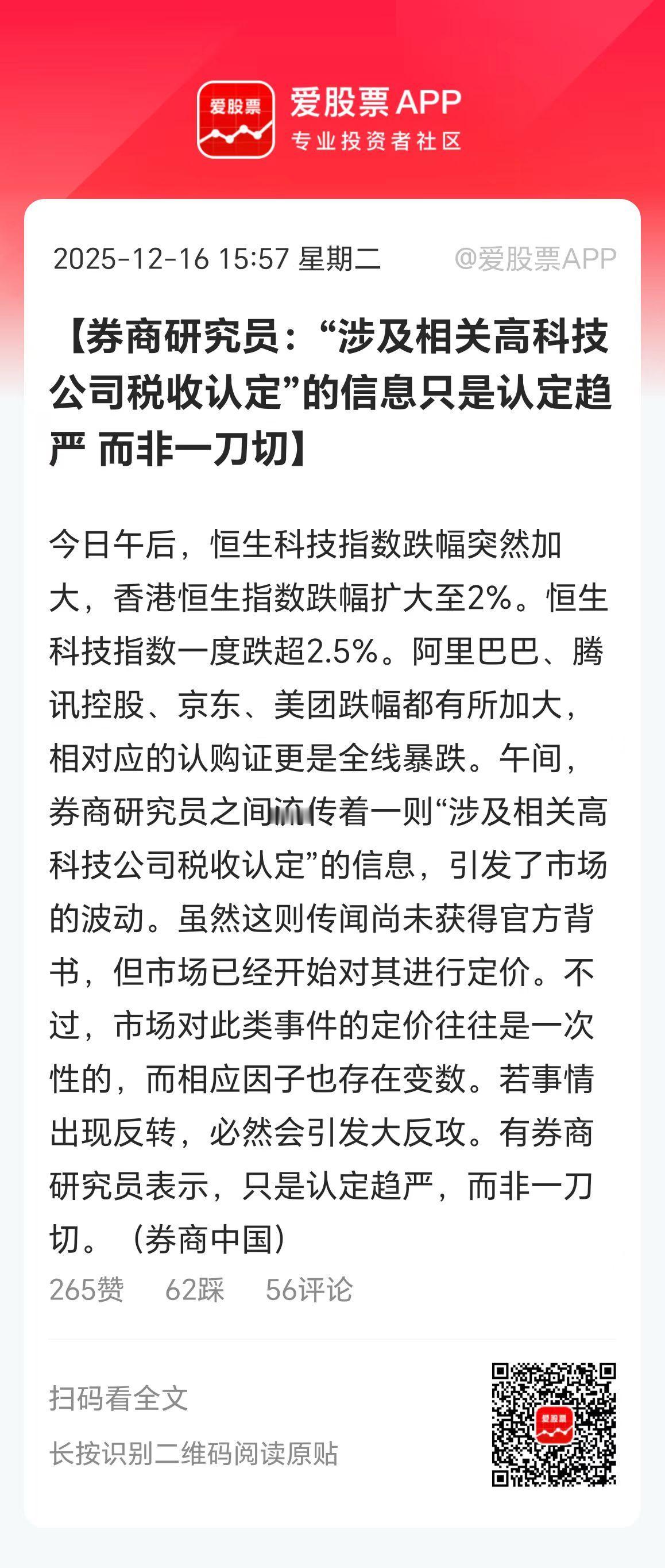 今天港股大跌,跟市场传言“互联网要按25%交税,不再维持15%高新技术企业的税率