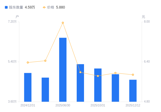 日期A股户数(户)流通A股户均持股数(股)户均持股市值(万元)2025-12-124590813465.347.922025-11-204839112774.417.602025-10-315095912130.677.072025-09-305289811686.016.992025-06-30647979540.057.592025-03-314685913192.068.502024-12-314895312627.768.042024-09-304709513125.957.352024-06-304739313043.425.872024-03-315463411314.695.17