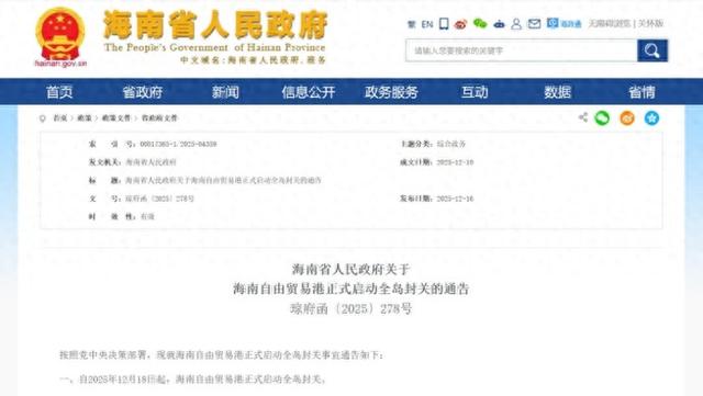 今天,海南省政府对外发布通告称:按照党中央决策部署,自2025年12月18日起,海南自由贸易港正式启动全岛封关。