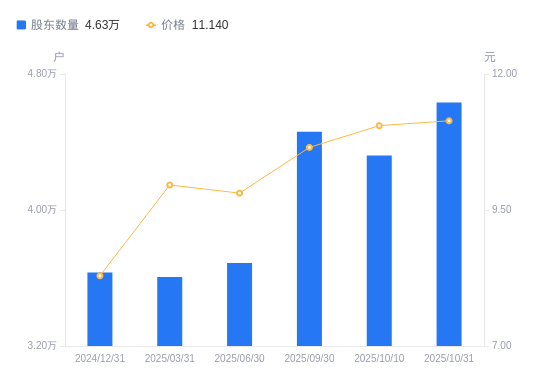 日期A股户数(户)流通A股户均持股数(股)户均持股市值(万元)2025-10-104321118149.6820.062025-09-304460317583.2518.732025-06-303688219339.9318.972025-03-313606619712.7719.632024-12-313632819570.6016.222024-09-304289716562.9310.502024-06-304356216305.068.842024-03-314798514772.318.082023-12-315186913666.146.782023-09-305193113649.836.65