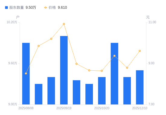 近一年(2024年12月31日至2025年12月10日),西安饮食A股股东户数从11.91万户,减低至9.5万户,降幅20.25%,区间股价下跌1.13%。