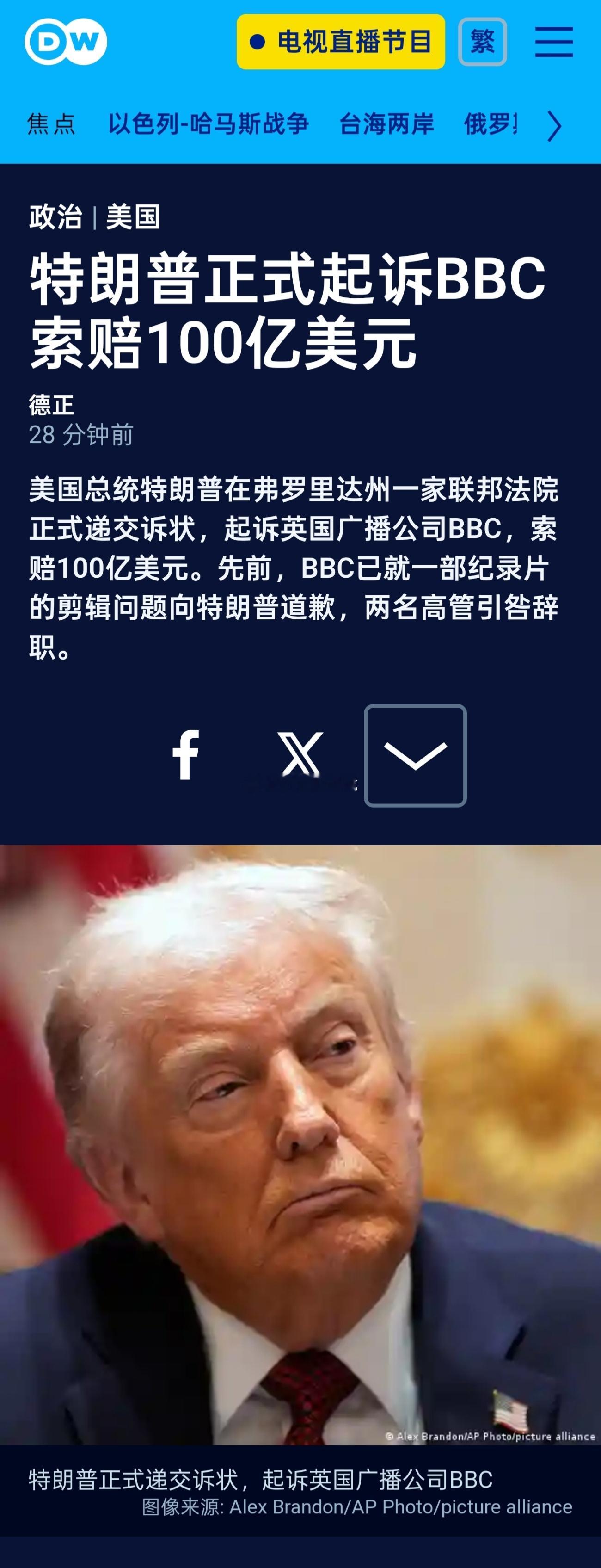 美国总统特朗普在弗罗里达州一家联邦法院正式递交诉状,起诉英国广播公司BBC,索赔100亿美元。先前,BBC已就一部纪录片的剪辑问题向特朗普道歉,两名高管引咎辞职。BBC旗舰节目《全景》曾播出的一部纪录片,剪辑了特朗普2021年1月6日在国会大厦外演讲中的两段片段,包括他呼吁支持者游行至国会大厦,以及他喊出“拼死一搏”的内容,但省略了他呼吁和平抗议的部分。特朗普的诉讼称,BBC对他进行了诽谤,同时违反了佛罗里达州禁止欺骗性和不公平贸易行为的法律。针对以上两项指控,每项索赔50亿美元。