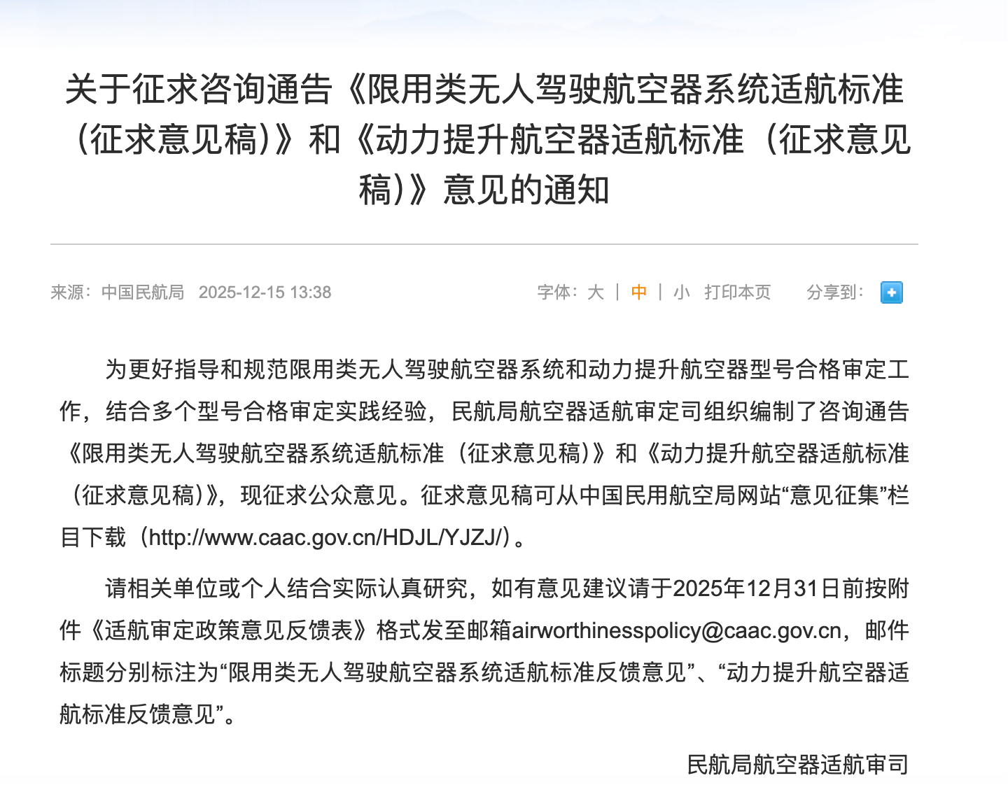 通知提出,为更好指导和规范限用类无人驾驶航空器系统和动力提升航空器型号合格审定工作,结合多个型号合格审定实践经验,民航局航空器适航审定司组织编制了咨询通告《限用类无人驾驶航空器系统适航标准(征求意见稿)》和《动力提升航空器适航标准(征求意见稿)》,现征求公众意见。