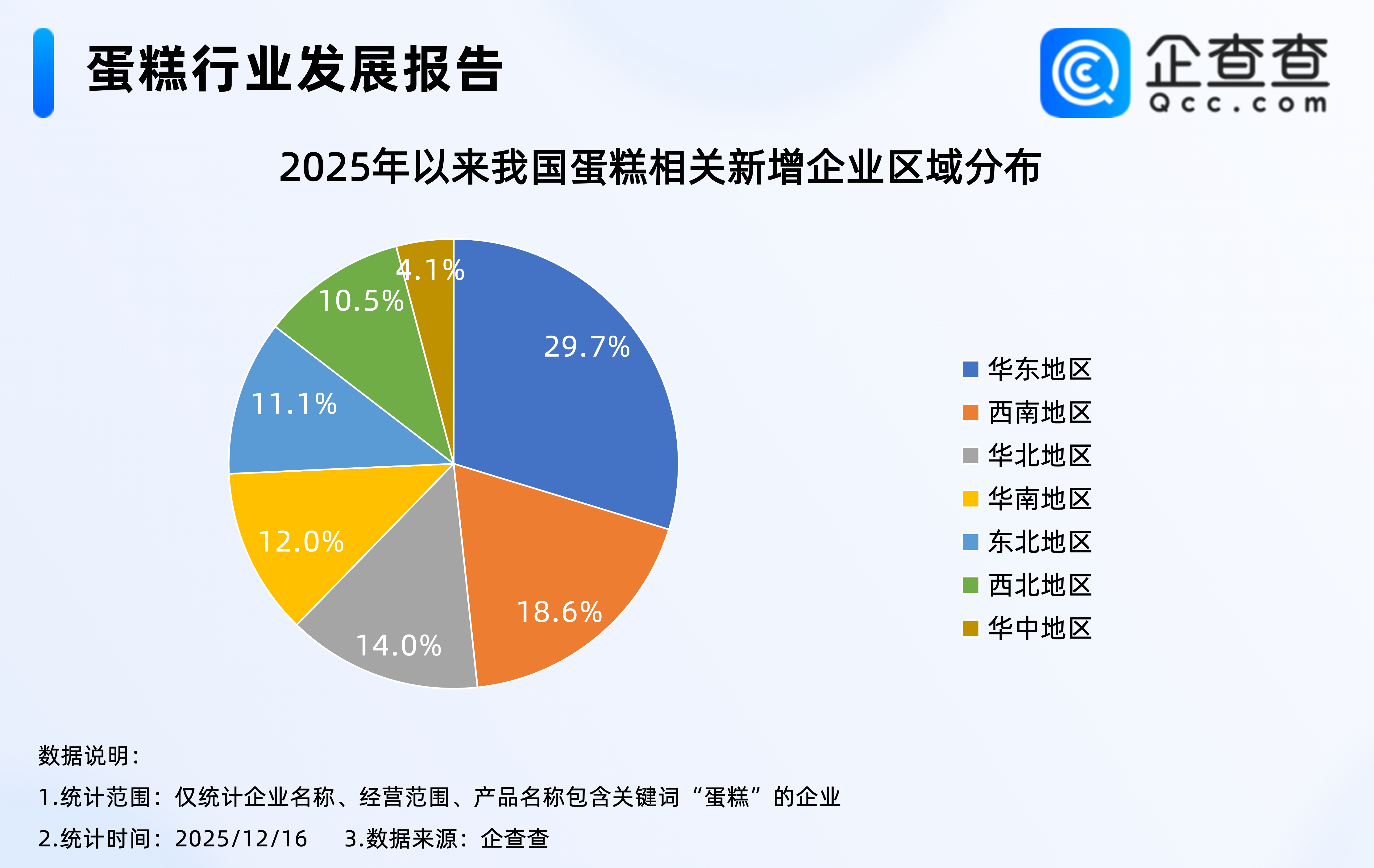 企查查数据显示,截至12月16日,2025年我国已注册2.35万家蛋糕相关企业,其中,分布在华东地区的相关企业最多,占比29.7%,与总存量区域分布不同的是,2025年以来新注册企业中,近20%的企业分布在西南地区,占比达18.6%,仅次于华东地区。