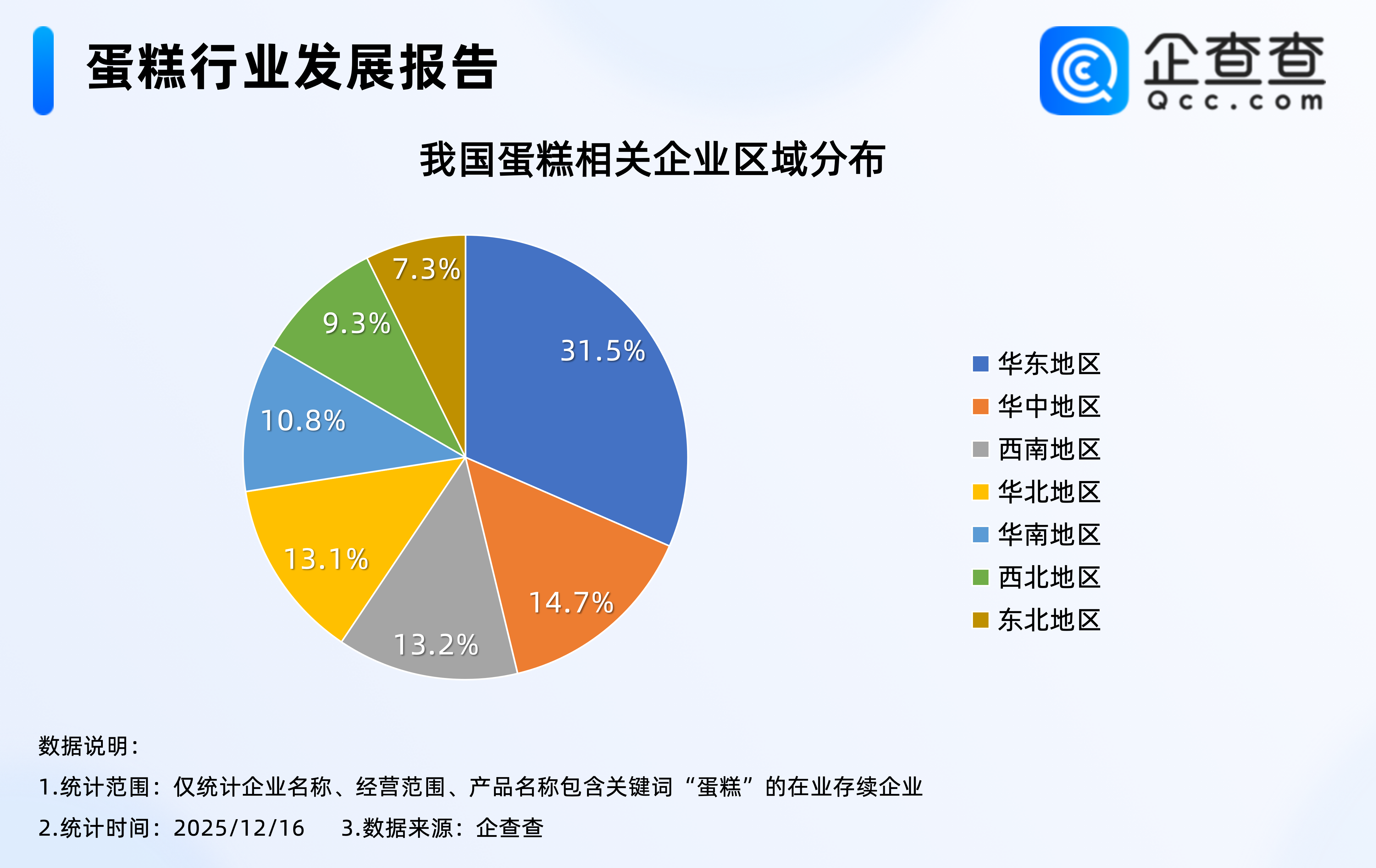 企查查数据显示,区域分布上,我国华东地区现存蛋糕相关企业最多,占全国总存量的31.5%,其次是华中、西南地区,分别占比14.7%、13.2%,东北地区占比相对最少,为7.3%。