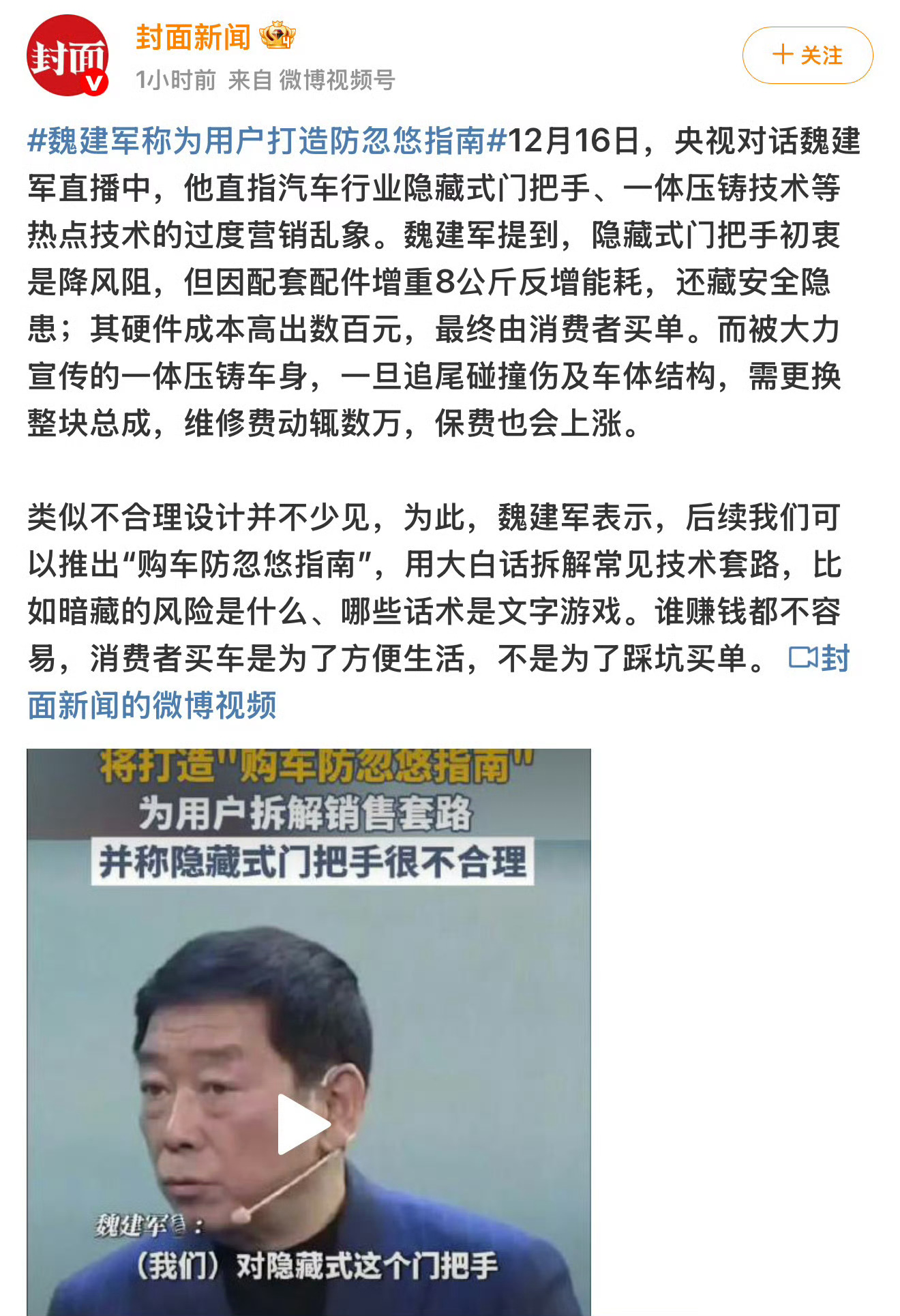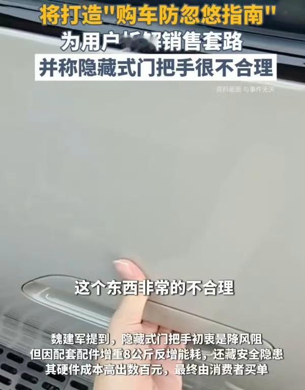 魏总这次确实说了不少大实话比如隐藏式门把手,减风阻效果有限,反倒给车增重不少。这设计到底是为谁服务?恐怕更多是跟风营销…现在这类设计不少,他提出要做“防忽悠指南”,就是想把这些营销噱头拆开说清楚,让选车回归实用本身。敢这么直接点破。魏建军称为用户打造防忽悠指南魏建军说让每一个零件多工作10年