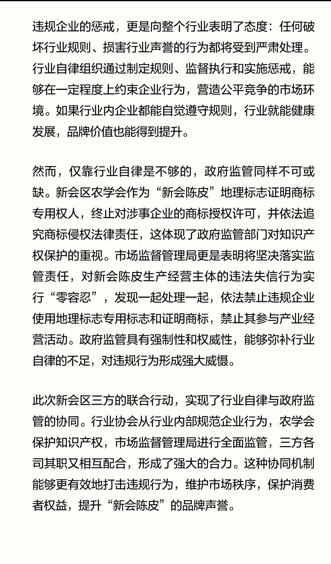 | 央视曝光新会陈皮年份虚标等问题后,新会区迅速行动,市场监督管理局、陈皮行业协会、农学会联合发布声明,对涉事企业采取严厉措施,这一事件凸显了行业自律与监管协同在维护市场秩序和品牌声誉方面的关键作用。新会陈皮行业协会在此次事件中发挥了积极作用,依据协会章程,对涉事会员企业取消会员资格并列入黑名单,还限制其法定代表人等关联人员及后续投资企业入会。这种举措不仅是对违规企业的惩戒,更是向整个行业表明了态度:任何破坏行业规则、损害行业声誉的行为都将受到严肃处理。行业自律组织通过制定规则、监督执行和实施惩戒,能够在一定程度上约束企业行为,营造公平竞争的市场环境。如果行业内企业都能自觉遵守规则,行业就能健康发展,品牌价值也能得到提升。然而,仅靠行业自律是不够的,政府监管同样不可或缺。新会区农学会作为“新会陈皮”地理标志证明商标专用权人,终止对涉事企业的商标授权许可,并依法追究商标侵权法律责任,这体现了政府监管部门对知识产权保护的重视。市场监督管理局更是表明将坚决落实监管责任,对新会陈皮生产经营主体的违法失信行为实行“零容忍”,发现一起处理一起,依法禁止违规企业使用地理标志专用标志和证明商标,禁止其参与产业经营活动。政府监管具有强制性和权威性,能够弥补行业自律的不足,对违规行为形成强大威慑。此次新会区三方的联合行动,实现了行业自律与政府监管的协同。行业协会从行业内部规范企业行为,农学会保护知识产权,市场监督管理局进行全面监管,三方各司其职又相互配合,形成了强大的合力。这种协同机制能够更有效地打击违规行为,维护市场秩序,保护消费者权益,提升“新会陈皮”的品牌声誉。新会陈皮事件为其他行业提供了借鉴。行业自律和政府监管不是孤立存在的,只有二者协同发力,才能构建一个健康、有序、可持续发展的市场环境,让品牌在市场中绽放光彩。