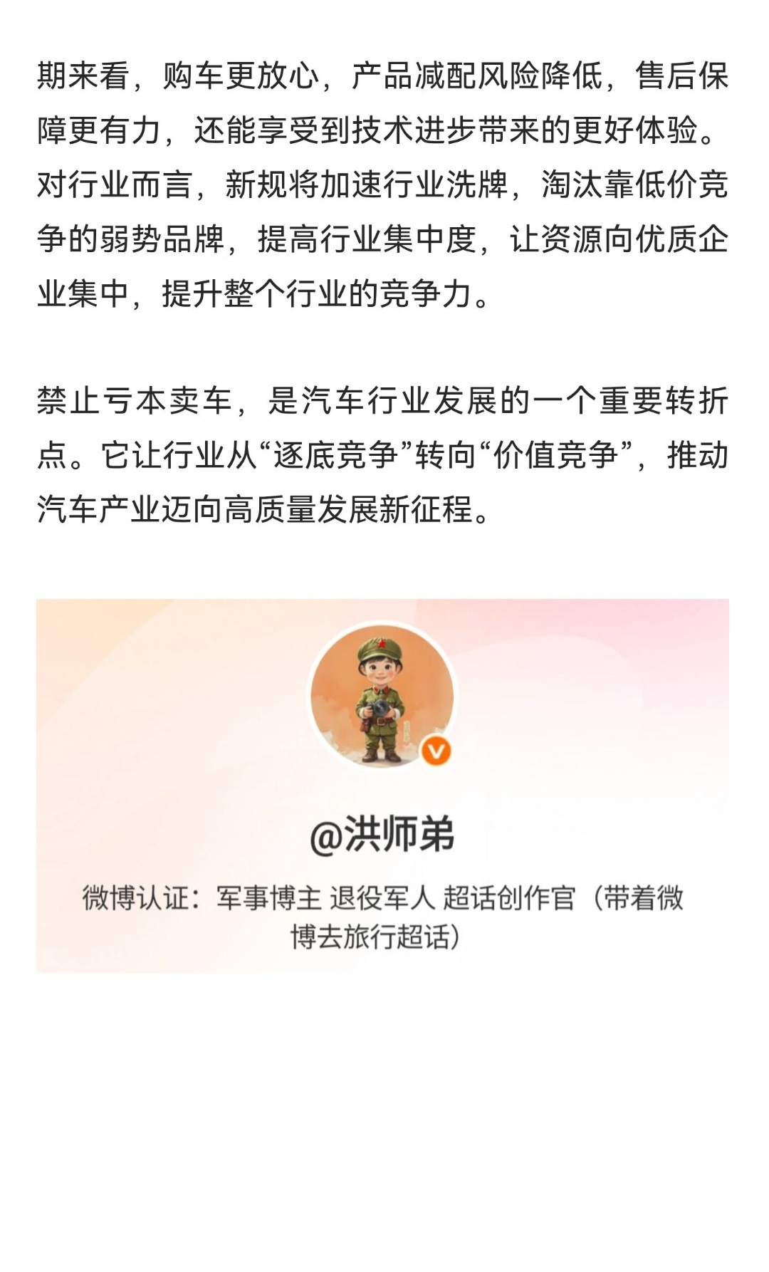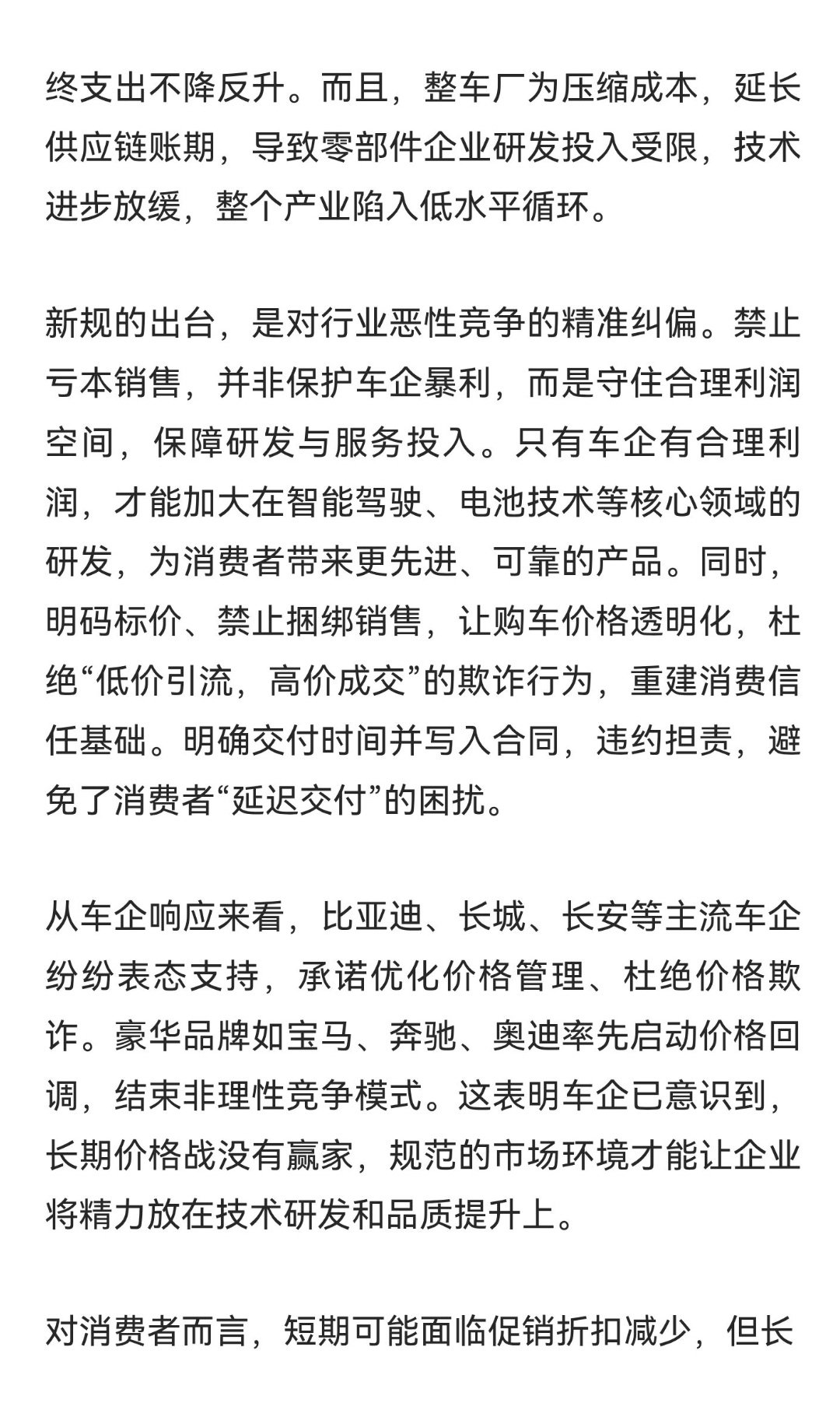 | 国家市场监督管理总局发布的《汽车行业价格行为合规指南(征求意见稿)》,明确禁止车企以低于成本价销售车辆,这一政策犹如一记重锤,敲响了汽车行业恶性价格战的警钟,也为行业高质量发展指明了方向。过去几年,汽车市场深陷“内卷式”价格战的泥沼。部分车企为抢占市场份额,不惜亏本卖车,看似让消费者短期获利,实则后患无穷。经销商利润被压至冰点,超半数传统燃油车经销商亏损,生存压力下,捆绑保险、强制装潢等变相盈利手段层出不穷,消费者看似低价购车,提车时却层层加码,最终支出不降反升。而且,整车厂为压缩成本,延长供应链账期,导致零部件企业研发投入受限,技术进步放缓,整个产业陷入低水平循环。新规的出台,是对行业恶性竞争的精准纠偏。禁止亏本销售,并非保护车企暴利,而是守住合理利润空间,保障研发与服务投入。只有车企有合理利润,才能加大在智能驾驶、电池技术等核心领域的研发,为消费者带来更先进、可靠的产品。同时,明码标价、禁止捆绑销售,让购车价格透明化,杜绝“低价引流,高价成交”的欺诈行为,重建消费信任基础。明确交付时间并写入合同,违约担责,避免了消费者“延迟交付”的困扰。从车企响应来看,比亚迪、长城、长安等主流车企纷纷表态支持,承诺优化价格管理、杜绝价格欺诈。豪华品牌如宝马、奔驰、奥迪率先启动价格回调,结束非理性竞争模式。这表明车企已意识到,长期价格战没有赢家,规范的市场环境才能让企业将精力放在技术研发和品质提升上。对消费者而言,短期可能面临促销折扣减少,但长期来看,购车更放心,产品减配风险降低,售后保障更有力,还能享受到技术进步带来的更好体验。对行业而言,新规将加速行业洗牌,淘汰靠低价竞争的弱势品牌,提高行业集中度,让资源向优质企业集中,提升整个行业的竞争力。禁止亏本卖车,是汽车行业发展的一个重要转折点。它让行业从“逐底竞争”转向“价值竞争”,推动汽车产业迈向高质量发展新征程。