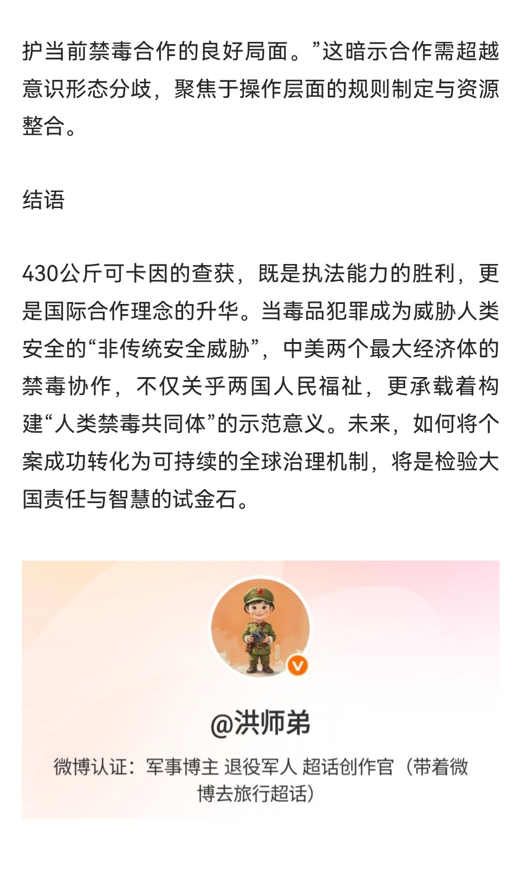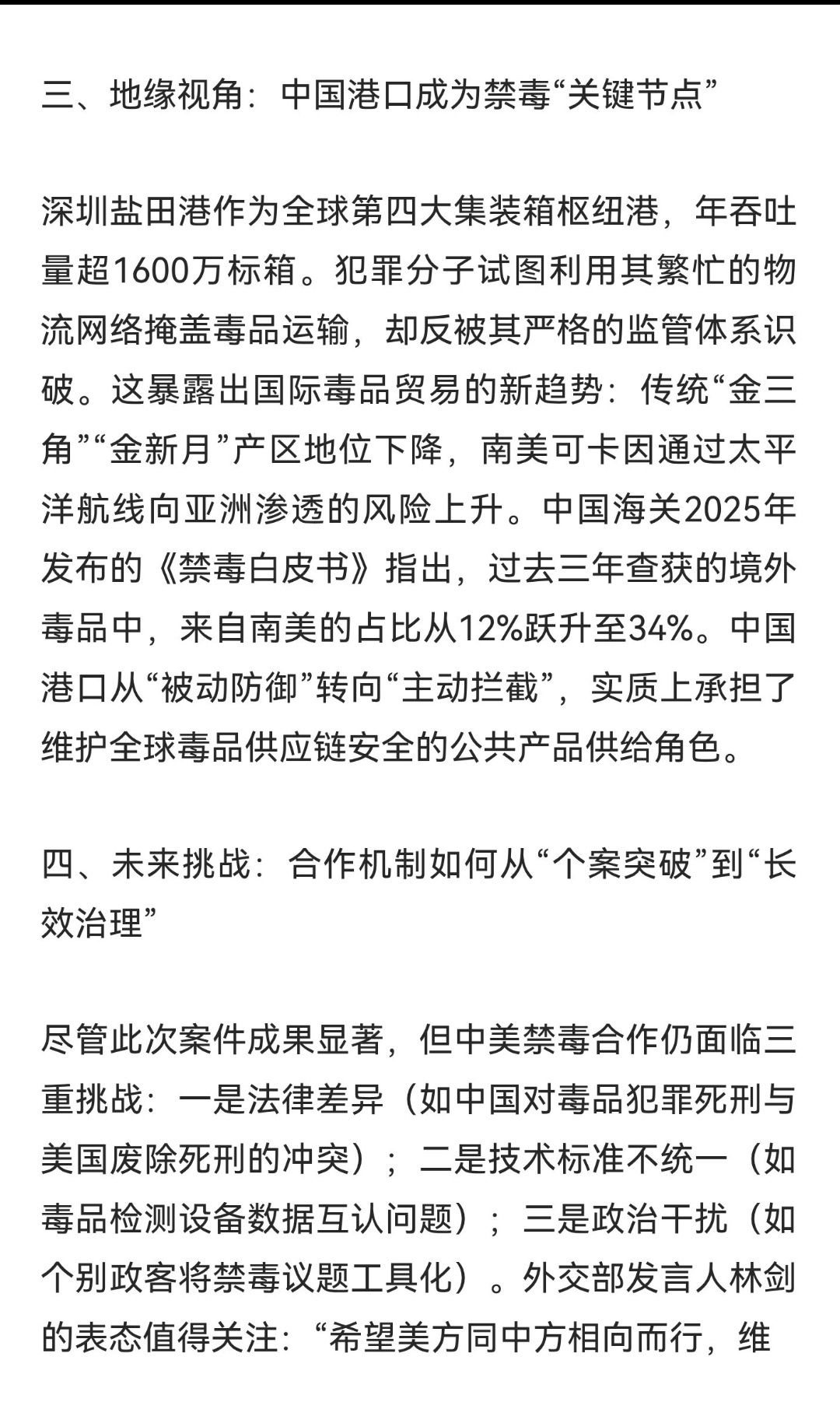 | 2025年11月26日,中国深圳盐田港一国际货柜中查获430公斤可卡因,这起由中美禁毒部门联合侦破的案件,不仅刷新了近年来单次查获可卡因数量的纪录,更成为两国禁毒合作从“争议”走向“务实”的标志性事件。此次查获的430公斤可卡因若流入市场,按黑市价格估算价值超2亿美元,足以制造数百万剂致命毒品。案件侦破的关键在于中美情报系统的无缝对接——美国缉毒署通过大数据分析锁定可疑货柜,中国禁毒部门运用智能查验设备(如X光扫描、化学试剂检测)在72小时内完成从线索接收到货物扣押的全流程。这种“情报驱动+技术赋能”的模式,打破了传统禁毒合作中“信息滞后、响应迟缓”的瓶颈,为全球毒品治理提供了新范本。中美禁毒合作曾因芬太尼问题陷入僵局:美方曾指责中国“输出芬太尼前体”,中方则以“整类列管芬太尼类物质”(2019年全球首个)回应。此次可卡因案的联合侦破,标志着两国合作从“责任推诿”转向“风险共治”。中国禁毒网披露的数据显示,2024年以来,中美联合破获的跨国毒品案件同比增长37%,其中70%涉及南美可卡因经东南亚转运至北美的路线。这种转变的底层逻辑在于:当毒品犯罪呈现“全球化生产、链条化运输、区域化消费”特征时,任何单一国家都无法独善其身。深圳盐田港作为全球第四大集装箱枢纽港,年吞吐量超1600万标箱。犯罪分子试图利用其繁忙的物流网络掩盖毒品运输,却反被其严格的监管体系识破。这暴露出国际毒品贸易的新趋势:传统“金三角”“金新月”产区地位下降,南美可卡因通过太平洋航线向亚洲渗透的风险上升。中国海关2025年发布的《禁毒白皮书》指出,过去三年查获的境外毒品中,来自南美的占比从12%跃升至34%。中国港口从“被动防御”转向“主动拦截”,实质上承担了维护全球毒品供应链安全的公共产品供给角色。尽管此次案件成果显著,但中美禁毒合作仍面临三重挑战:一是法律差异(如中国对毒品犯罪死刑与美国废除死刑的冲突);二是技术标准不统一(如毒品检测设备数据互认问题);三是政治干扰(如个别政客将禁毒议题工具化)。外交部发言人林剑的表态值得关注:“希望美方同中方相向而行,维护当前禁毒合作的良好局面。”这暗示合作需超越意识形态分歧,聚焦于操作层面的规则制定与资源整合。430公斤可卡因的查获,既是执法能力的胜利,更是国际合作理念的升华。当毒品犯罪成为威胁人类安全的“非传统安全威胁”,中美两个最大经济体的禁毒协作,不仅关乎两国人民福祉,更承载着构建“人类禁毒共同体”的示范意义。未来,如何将个案成功转化为可持续的全球治理机制,将是检验大国责任与智慧的试金石。