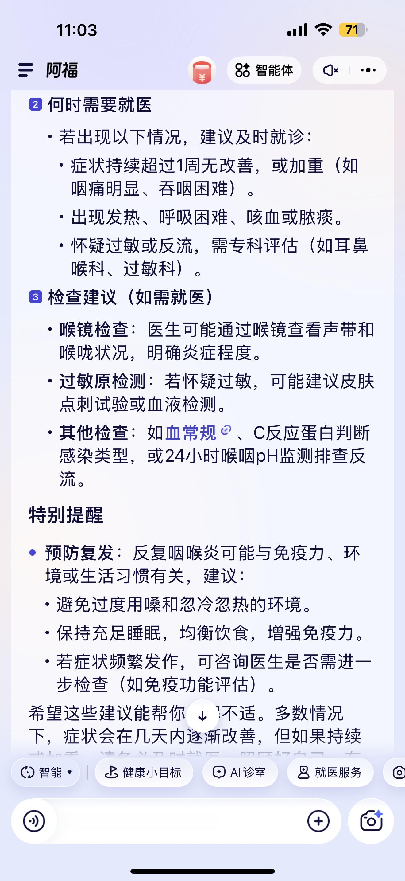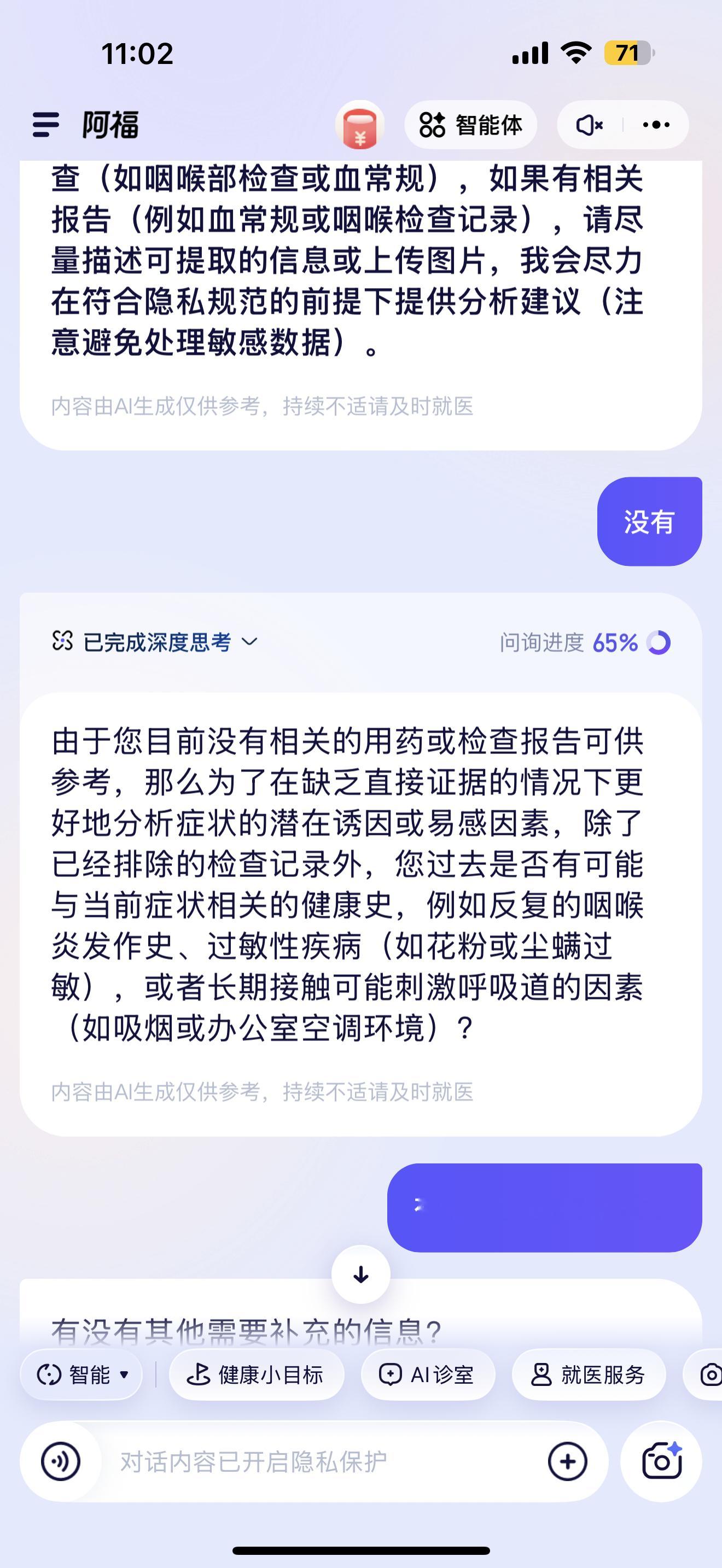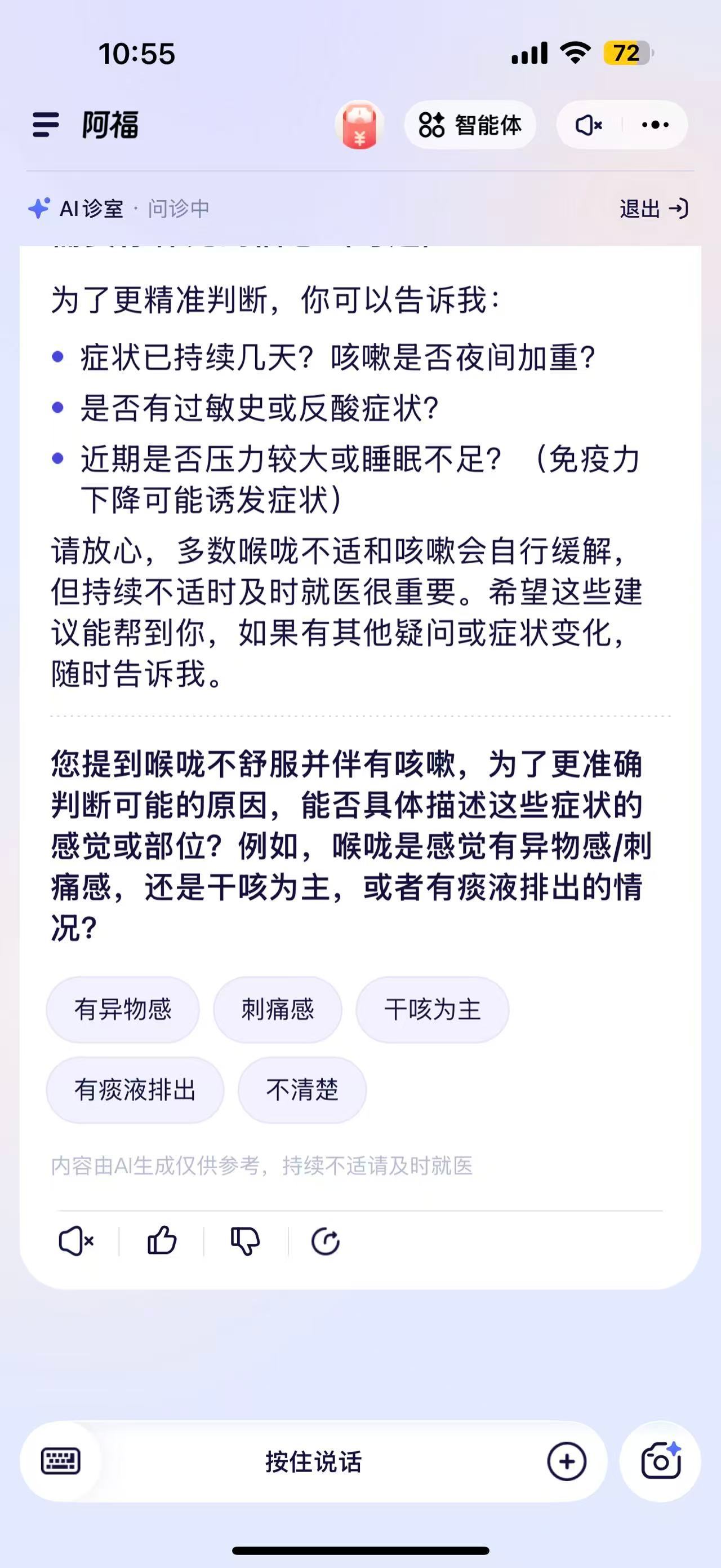 我说不舒服AI竟追问12次 最近换季流感挺严重的,我也没躲过,喉咙痒、有点咳嗽,又怕去医院交叉感染,抱着试试看的心态打开「蚂蚁阿福」,结果被它的“AI诊室”模式惊到了~它简单了解我个人情况之后,我就说了一句:“喉咙不舒服,有点咳嗽”,没想到它没有直接给一堆泛泛的健康建议,而是像一个细心朋友一样,开始一步步问我:先是问我咳嗽有没有痰,有没有出现声音嘶哑,又追着问症状持续多久了,有没有用过非处方药物,甚至还可以上传咽喉部或血常规的检查记录,前前后后加起来,竟然耐心追问了我12个细节问题!经过这番梳理,我自己都感觉比之前更清楚自己的状态了。阿福最后给我的也不是什么“药方”,而是一份结合了我个人描述的、非常具体的分析参考和可采取的措施,还贴心提醒如果出现发热、呼吸困难等情况,一定要及时去医院。现在的阿福,更像是你的一个24小时在线的健康生活助手,在你感觉有些小毛病、不舒服时,能提供一个深入、个性化的交流。尤其是最近换季,身边感冒的人多,用它先做做功课,理清症状细节,无论是决定居家护理还是后续需要就医,都能心里更有谱~