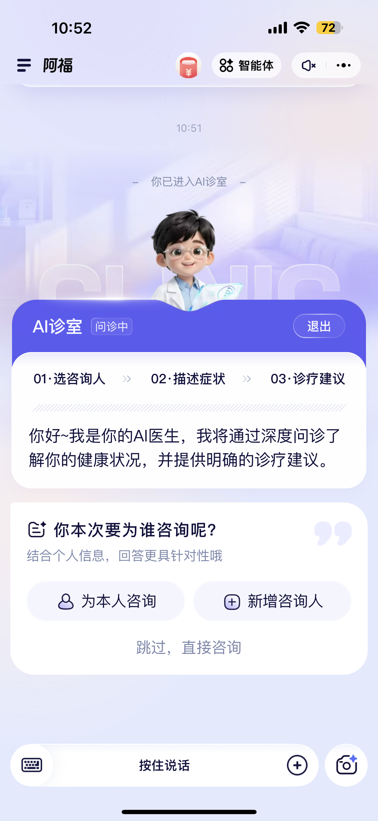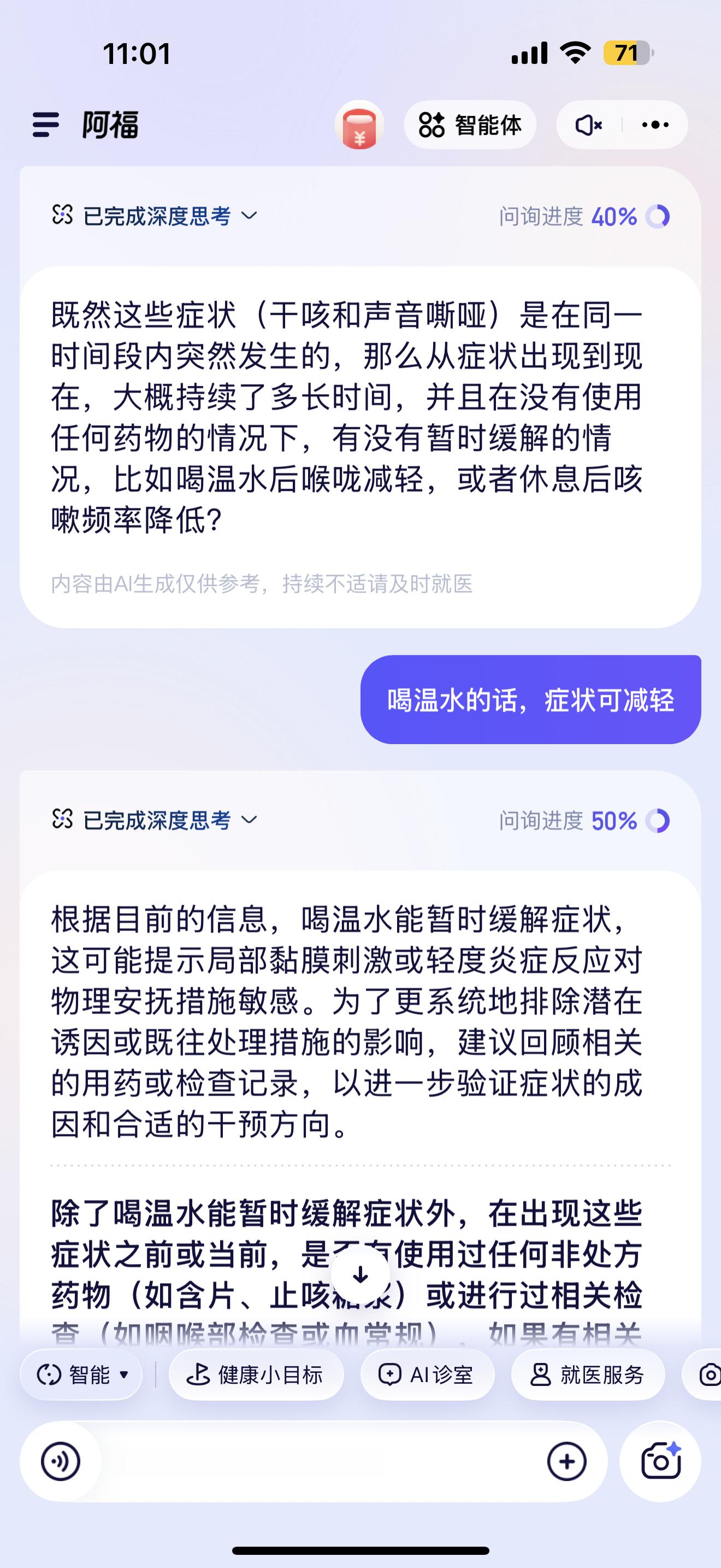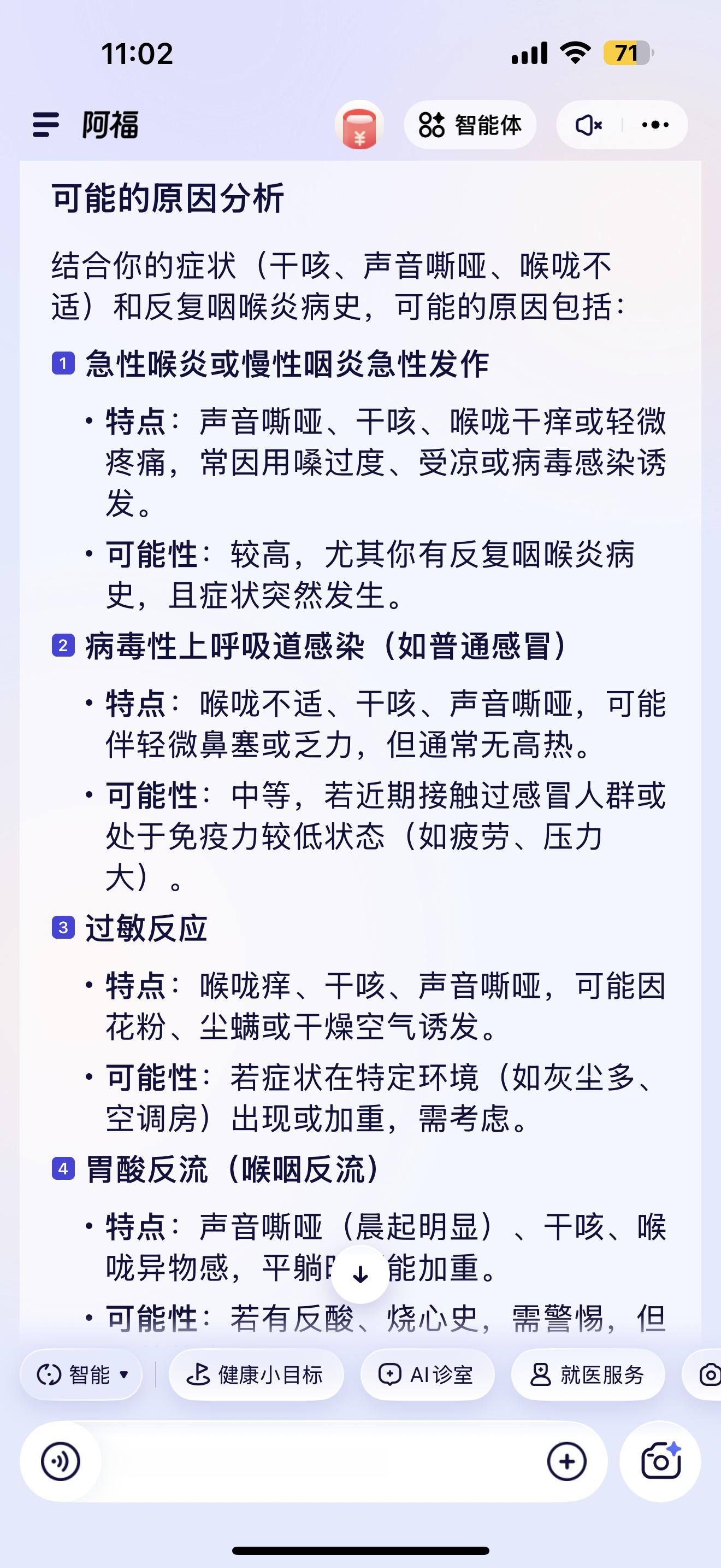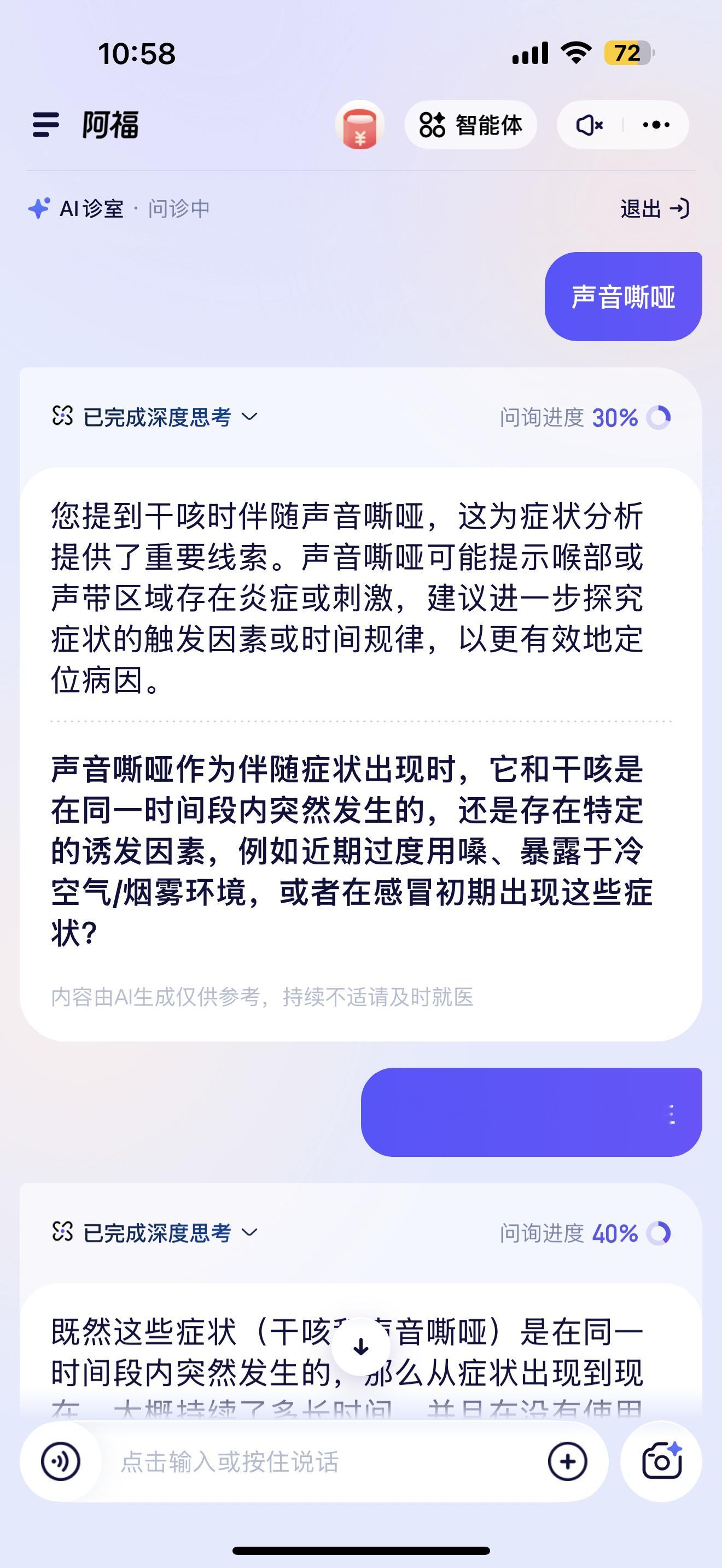 我说不舒服AI竟追问12次 最近换季流感挺严重的,我也没躲过,喉咙痒、有点咳嗽,又怕去医院交叉感染,抱着试试看的心态打开「蚂蚁阿福」,结果被它的“AI诊室”模式惊到了~它简单了解我个人情况之后,我就说了一句:“喉咙不舒服,有点咳嗽”,没想到它没有直接给一堆泛泛的健康建议,而是像一个细心朋友一样,开始一步步问我:先是问我咳嗽有没有痰,有没有出现声音嘶哑,又追着问症状持续多久了,有没有用过非处方药物,甚至还可以上传咽喉部或血常规的检查记录,前前后后加起来,竟然耐心追问了我12个细节问题!经过这番梳理,我自己都感觉比之前更清楚自己的状态了。阿福最后给我的也不是什么“药方”,而是一份结合了我个人描述的、非常具体的分析参考和可采取的措施,还贴心提醒如果出现发热、呼吸困难等情况,一定要及时去医院。现在的阿福,更像是你的一个24小时在线的健康生活助手,在你感觉有些小毛病、不舒服时,能提供一个深入、个性化的交流。尤其是最近换季,身边感冒的人多,用它先做做功课,理清症状细节,无论是决定居家护理还是后续需要就医,都能心里更有谱~
