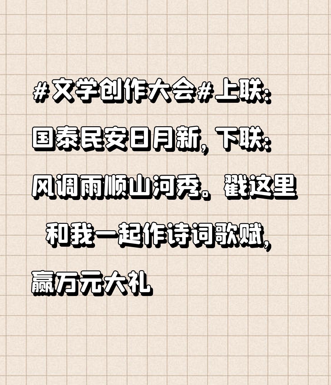 文学创作大会 这上联“国泰民安日月新”和下联“风调雨顺山河秀”对仗工整,读起来朗朗上口,描绘出一幅美好祥和的景象。文学创作大会这活动太赞了,能让人尽情展现才华,还有万元大礼拿。就像刘志英对的“货真价实主客多”“马到功成国运昌”也很不错,巧妙又有寓意。在诗词创作里,对仗是个技术活,像“风调雨顺”就有很多好的对仗。我也得赶紧参与进去,说不定灵感一来,能创作出超棒的诗词,把大奖收入囊中呢!