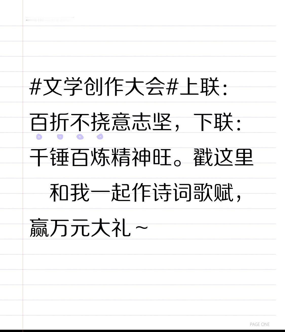 文学创作大会 文学创作大会这上联“百折不挠意志坚”太妙啦,下联“千锤百炼精神旺”也对仗工整。诗词歌赋的魅力就在于此,短短几句,却能传递出无尽的力量。就像杜甫的《登岳阳楼》,“吴楚东南坼,乾坤日夜浮”,仅十个字就勾勒出洞庭湖的磅礴气势。还有那些形容人坚强的成语,“百折不挠”用在这上联中恰到好处。现在有这赢万元大礼的机会,咱可不能错过,一起发挥创意,说不定大奖就到手咯!
