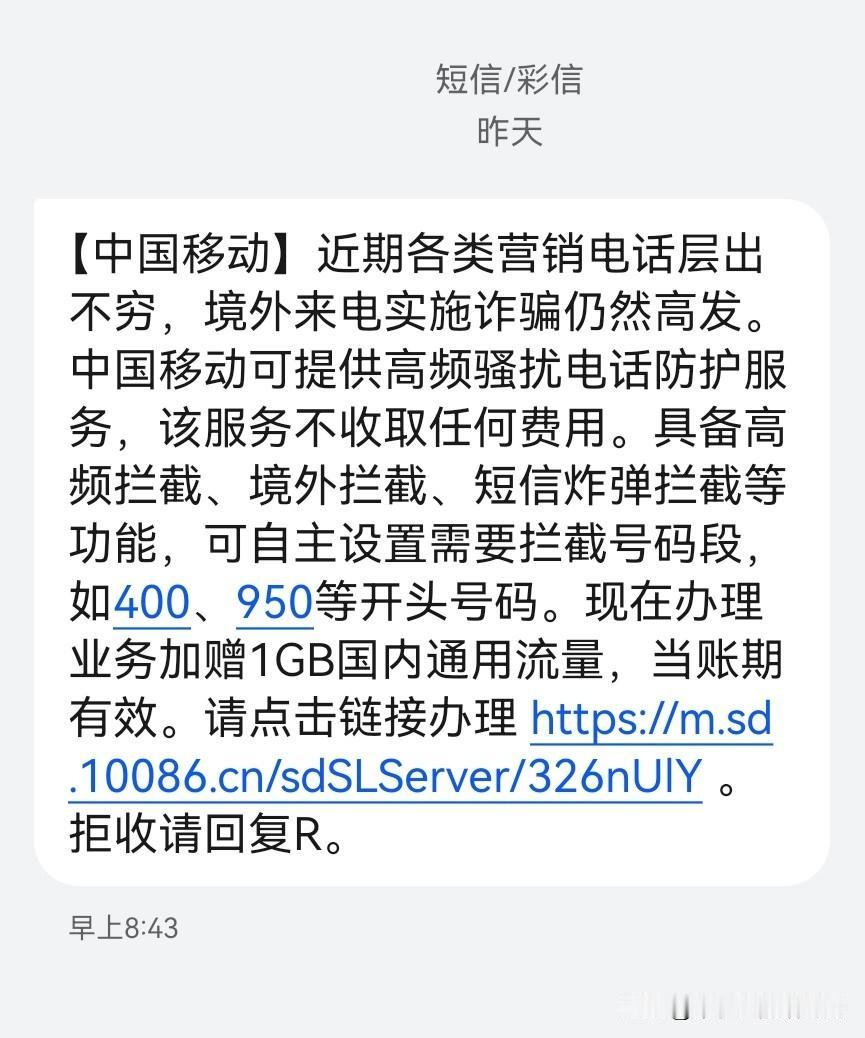 美国头一天给三大运营商下了通告,要求14天内解决诈骗骚扰电话问题,中国移动第二天就推出了免费防骚扰业务。多年的骚扰电话顽疾一朝解决。为中国移动的高效服务点赞👍👍👍👍骚扰电话诈骗
