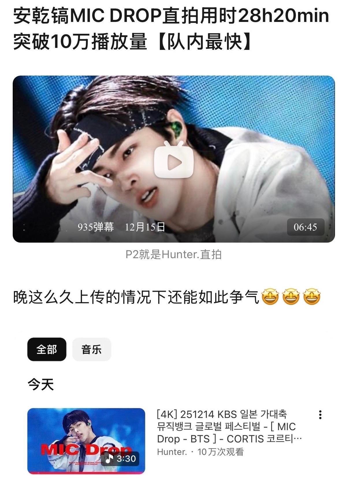 安乾镐MIC DROP直拍 舞台结束第二天上传,用时28h20min突破10万播