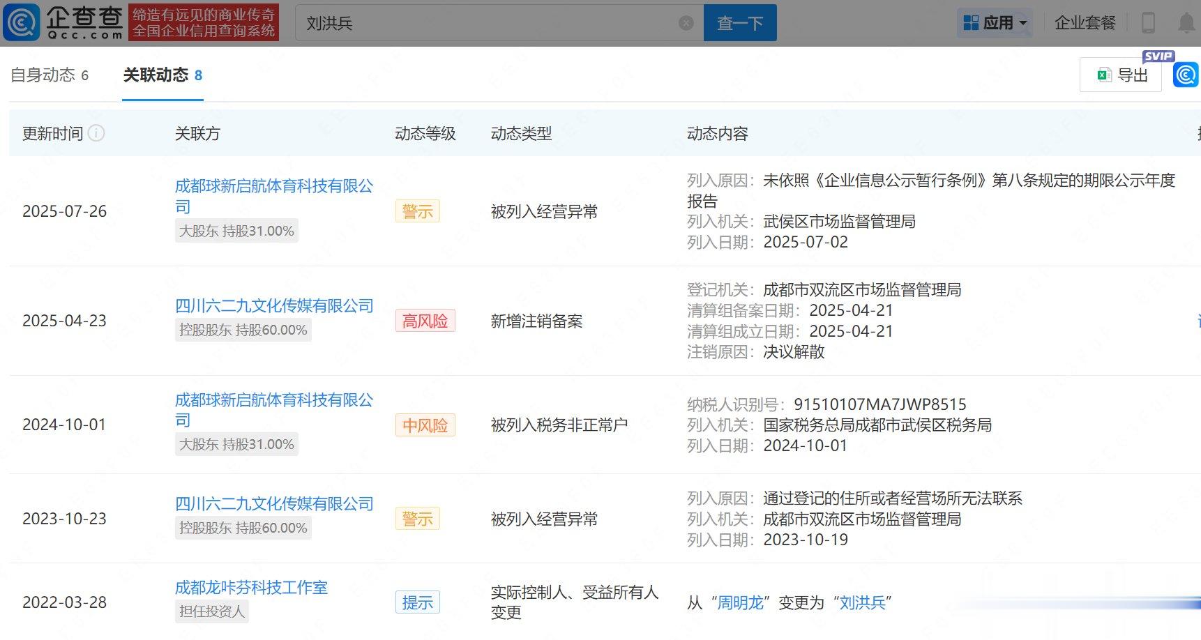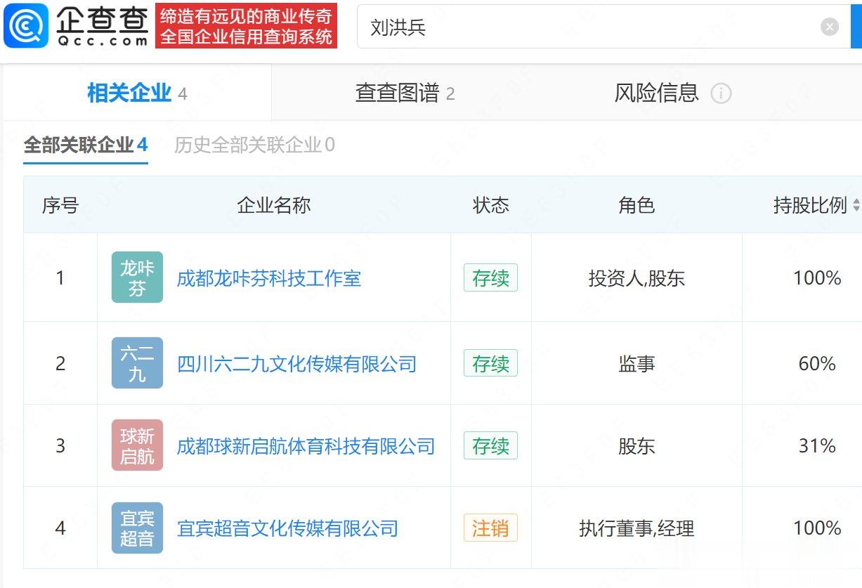 企查查APP显示,刘洪兵(刘二狗)名下共关联4家企业,其中1家已注销,3家存续企业中,成都球新启航体育科技有限公司今年7月因未规定期限公示年度报告被列入经营异常名录;四川六二九文化传媒有限公司今年4月新增注销备案,此前,该公司因通过登记的住所或者经营场所无法联系被列入经营异常名录。