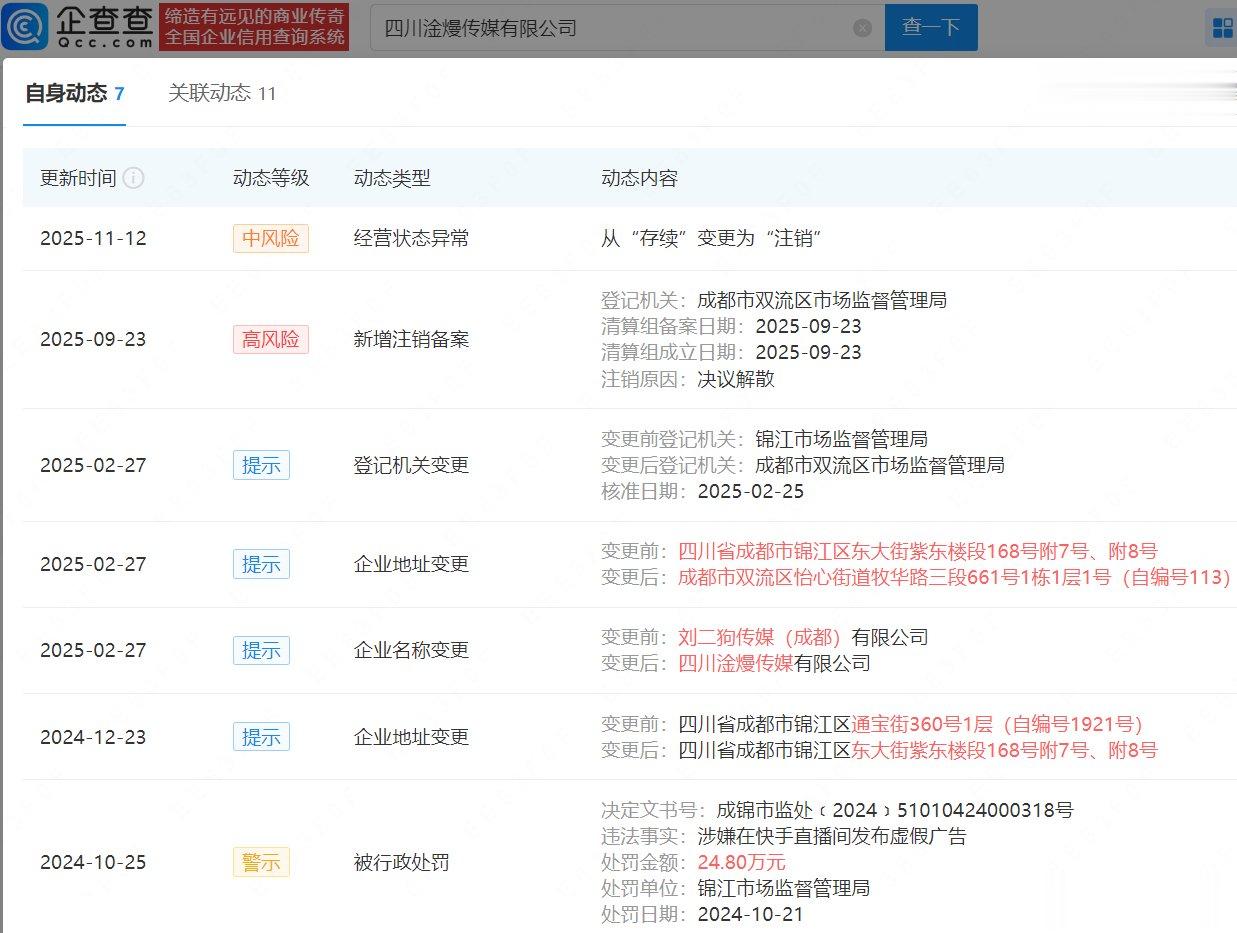 此外,原“刘二狗传媒(成都)有限公司”今年2月更名四川淦熳传媒有限公司,去年10月该公司因涉嫌在直播间发布虚假广告被罚24.8万元,今年11月已注销。该公司法定代表人郑彬持股的成都八十一分体育科技有限公司其余三位股东吴旭林、余伟、曾世美均为刘洪兵(刘二狗)合作伙伴,几人还共同持有成都球新启航体育科技有限公司股份。