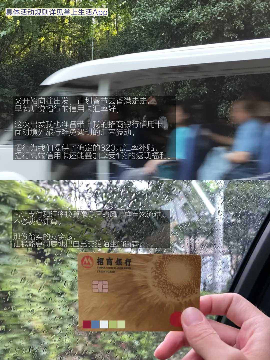 又开始向往出发,计划春节去香港走走。早就听说招行的信用卡汇率好,这次出发我也准备带上我的招商银行信用卡,面对境外旅行难免遇到的汇率波动,招行为我们提供了确定的320元汇率补贴,招行高端信用卡还能叠加享受1%的返现福利。