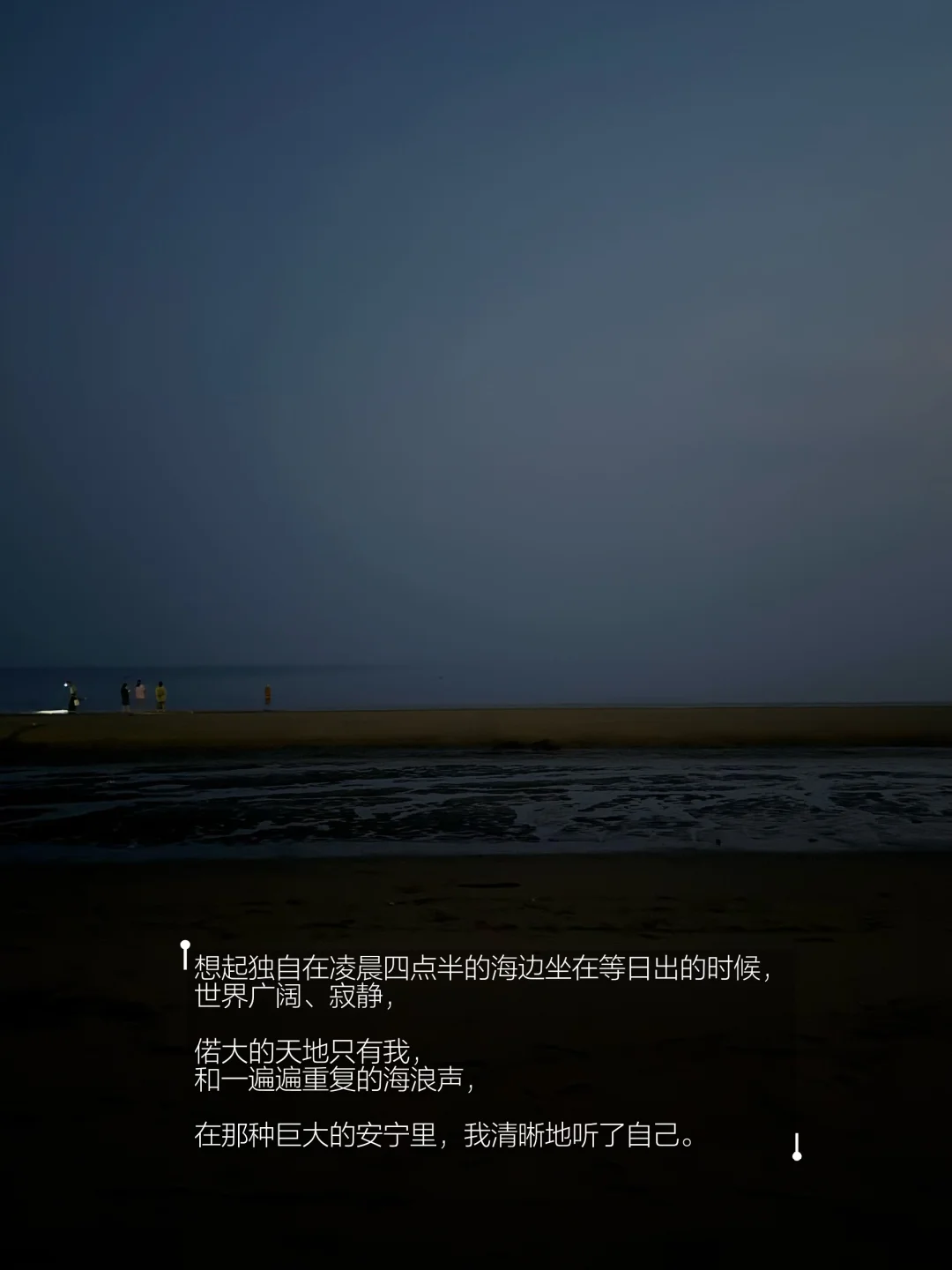 想起独自在凌晨四点半的海边坐在等日出的时候,世界广阔、寂静,偌大的天地只有我,和一遍遍重复的海浪声,在那种巨大的安宁里,我清晰地听了自己。