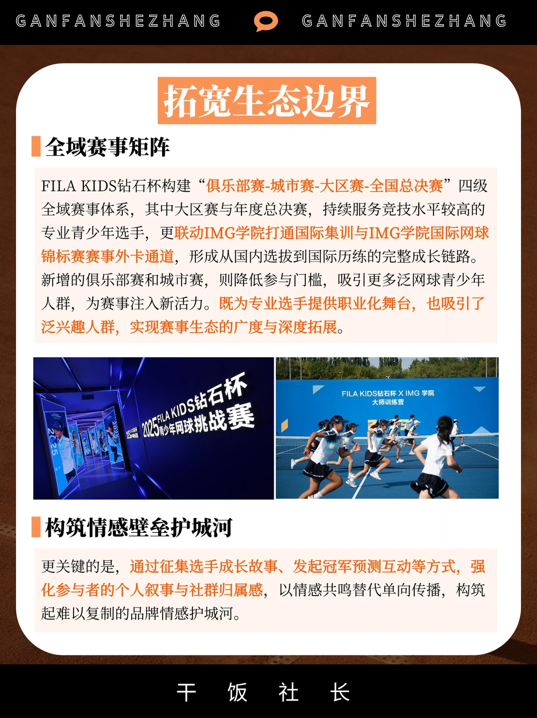✅专业端,品牌自 2021 年独家冠名钻石杯青少年网球挑战赛,2025年赛事升级为“俱乐部赛-城市赛-大区赛-全国总决赛”四级晋级体系,更联动 IMG 学院打通国际集训与IMG学院国际网球锦标赛外卡资源,为青少年球员提供职业化成长通路;