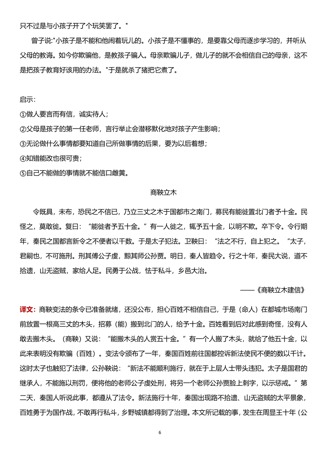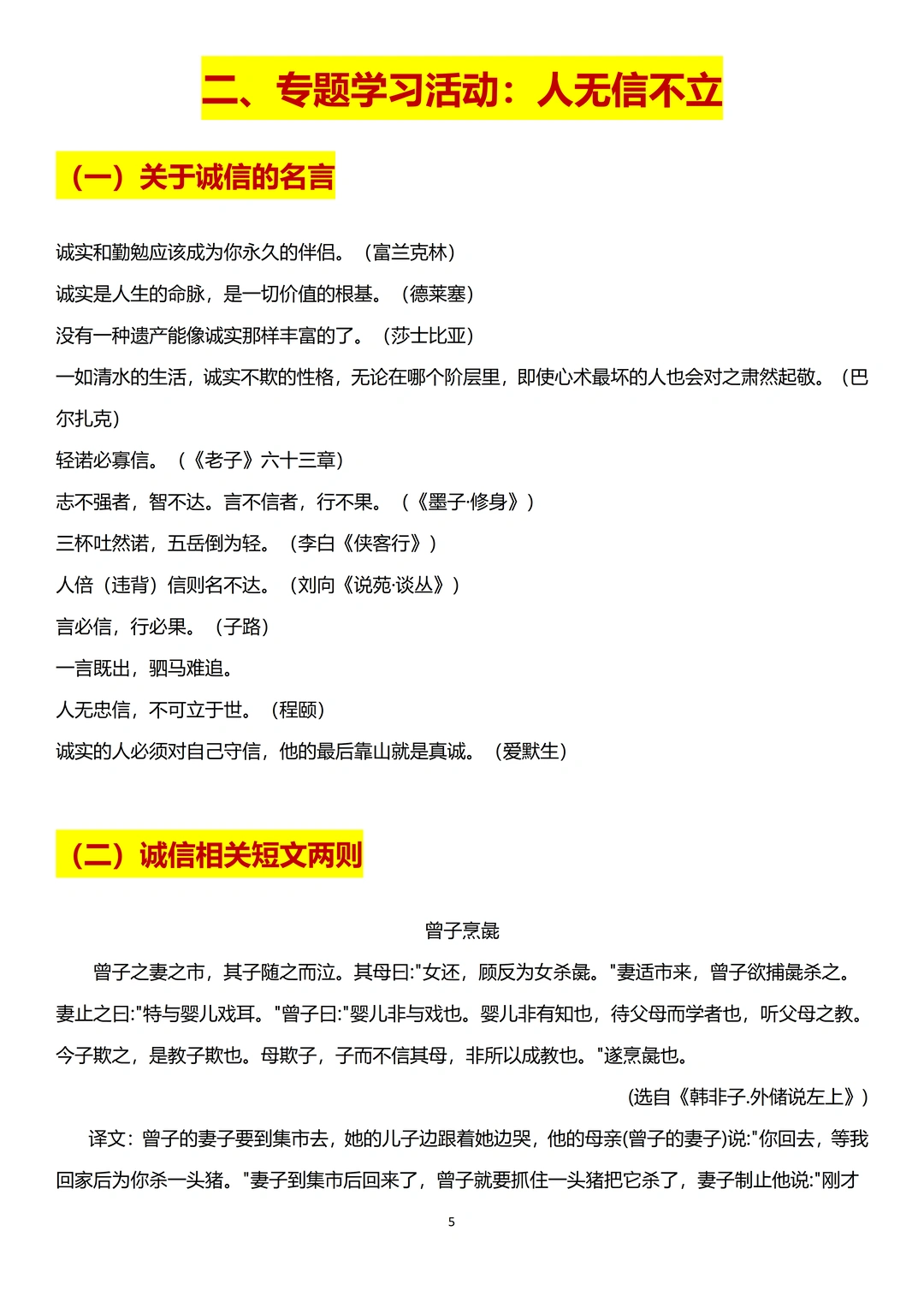 2、《人无信不立》: 积累好诚信的名言,还要熟记诚信相关的两个相关典故:《曾子烹彘》《商鞅立木》。要知道典故讲了什么,对我们的启发是什么,常常会考问答题。常考的还有观点题:让你谈谈诚信的好处。