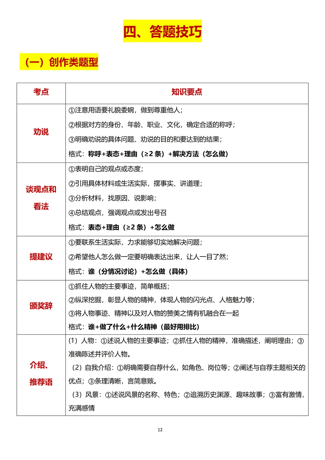 ✔创作类包括劝说、颁奖辞、介绍、开场白、串场词、宣传标语、广告词、对联等等,每一种题型的知识要点我都给大家列好了,掌握答题技巧再练题,提分效率翻倍!