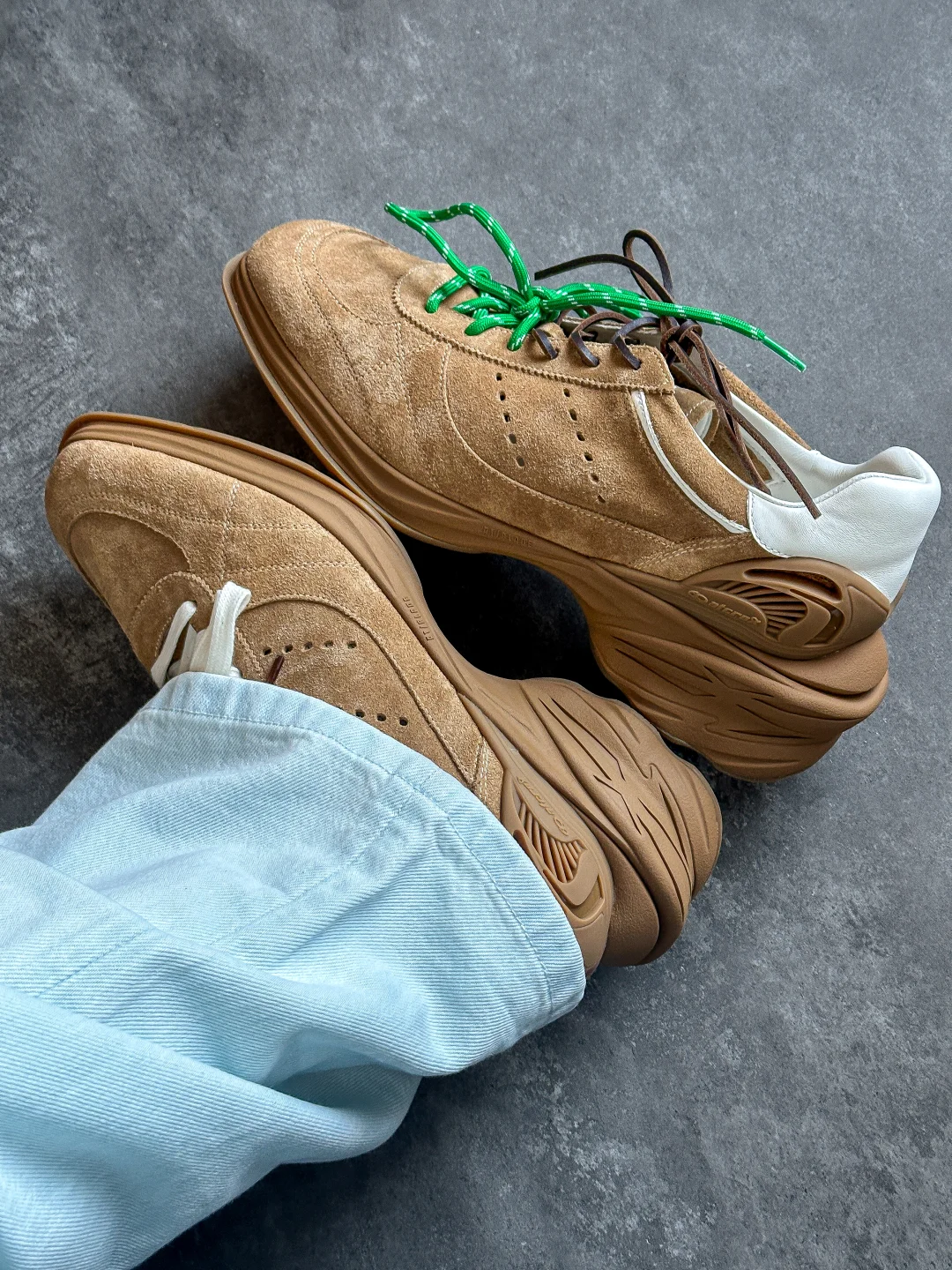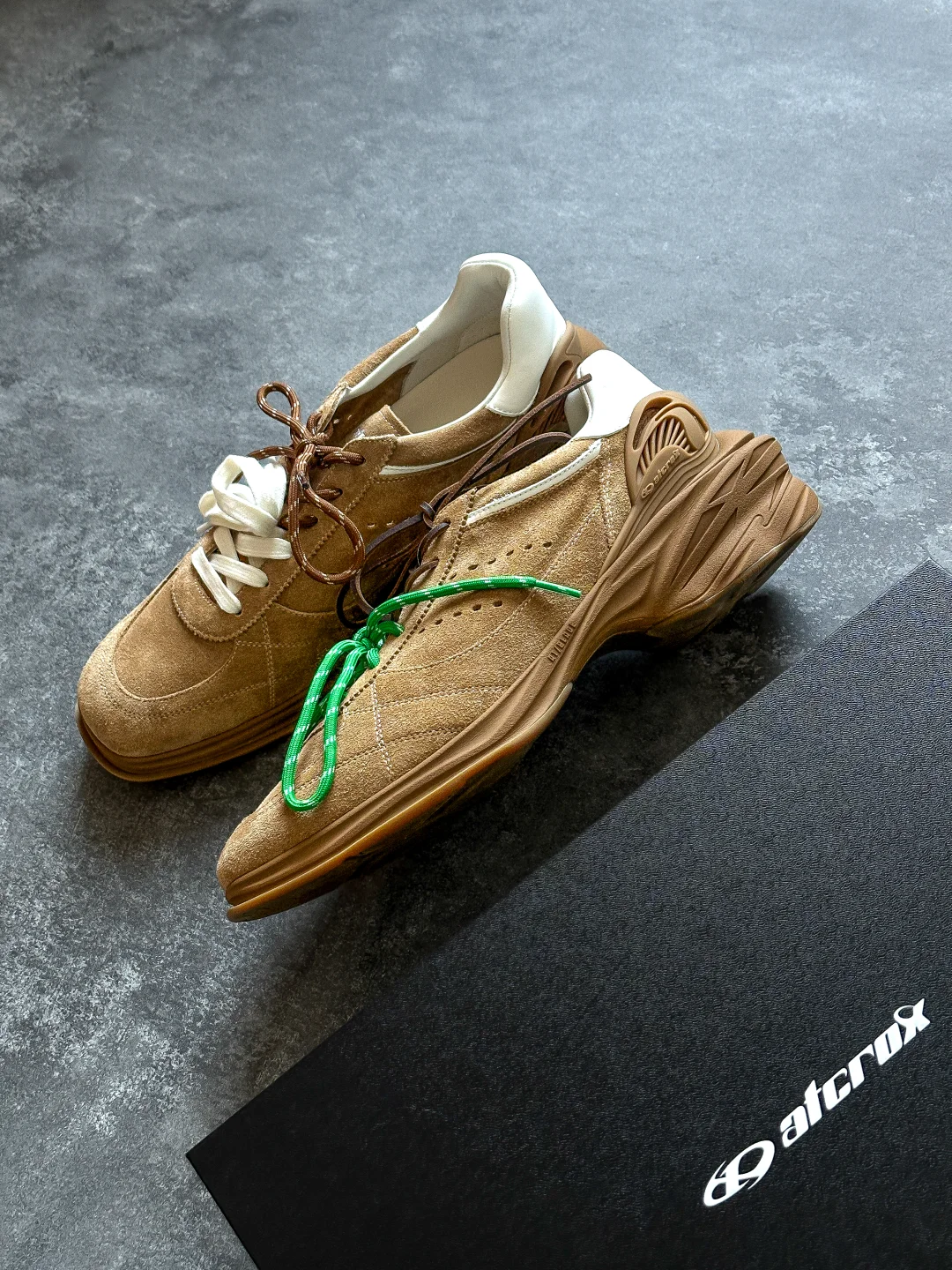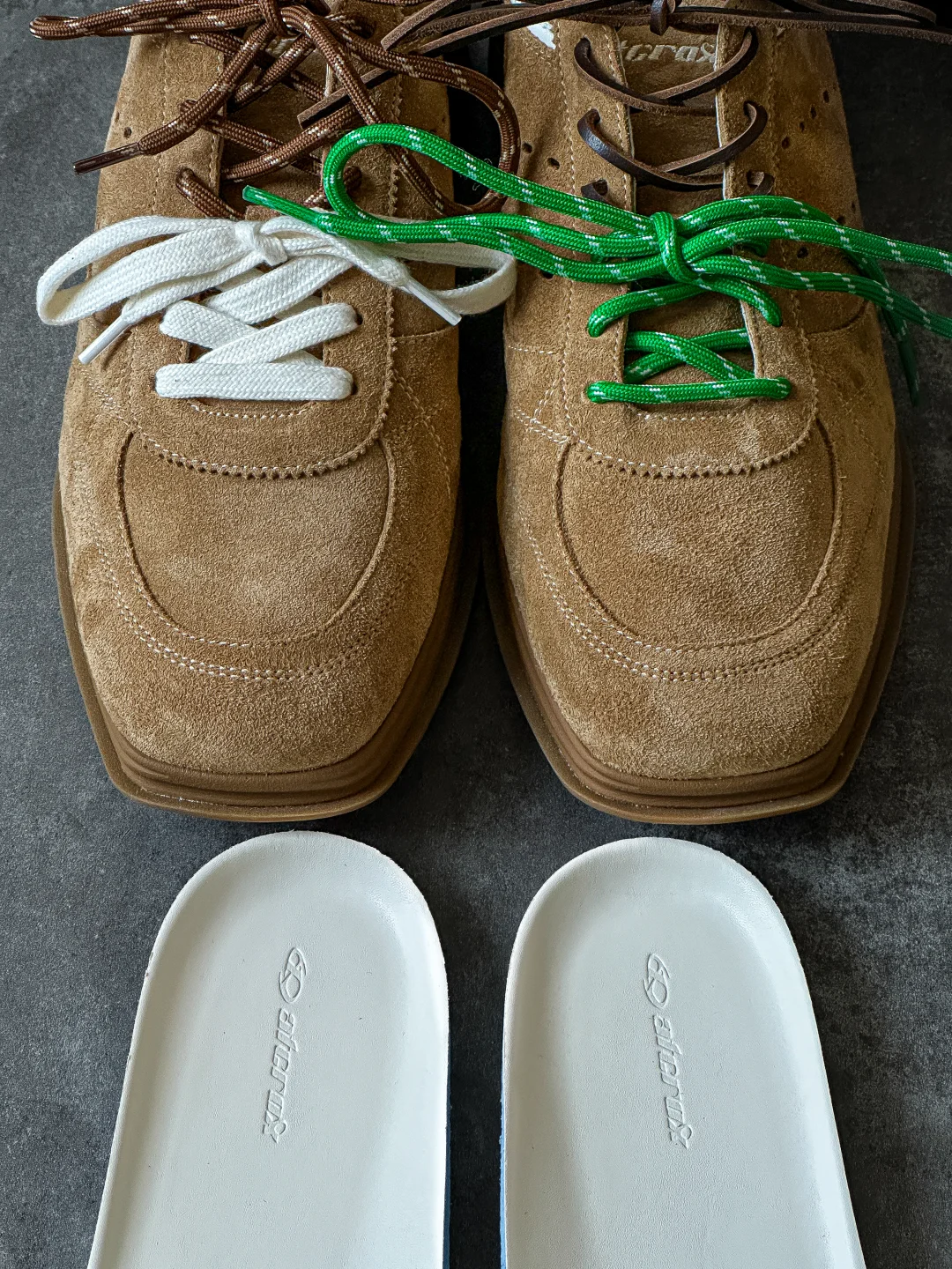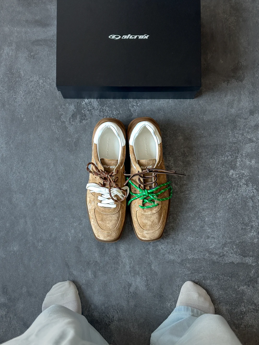 ❤️心仪了很久的小众鞋子,觉得是有自己设计风格在的。分享他们的一双新款TRIPLE 500: -混血气质: 异形后跟和鞋底相当抓眼球、而且有机的造型也很有特色。 鞋头很有意思的做了一个小方头,盖鞋面穿的时候露出来很别致。 -细节丰富: 鞋面采用了柔软的麂皮、刷色感明显,舒适度也不错。同时用白色的线做了鞋面划分,很细节。 配有白色和棕色的混色鞋带(绿色是我自己配的)。皮质的鞋尾、内衬和鞋垫也兼具点睛和质感。 作为彩蛋、增高效果也不错[偷笑R]