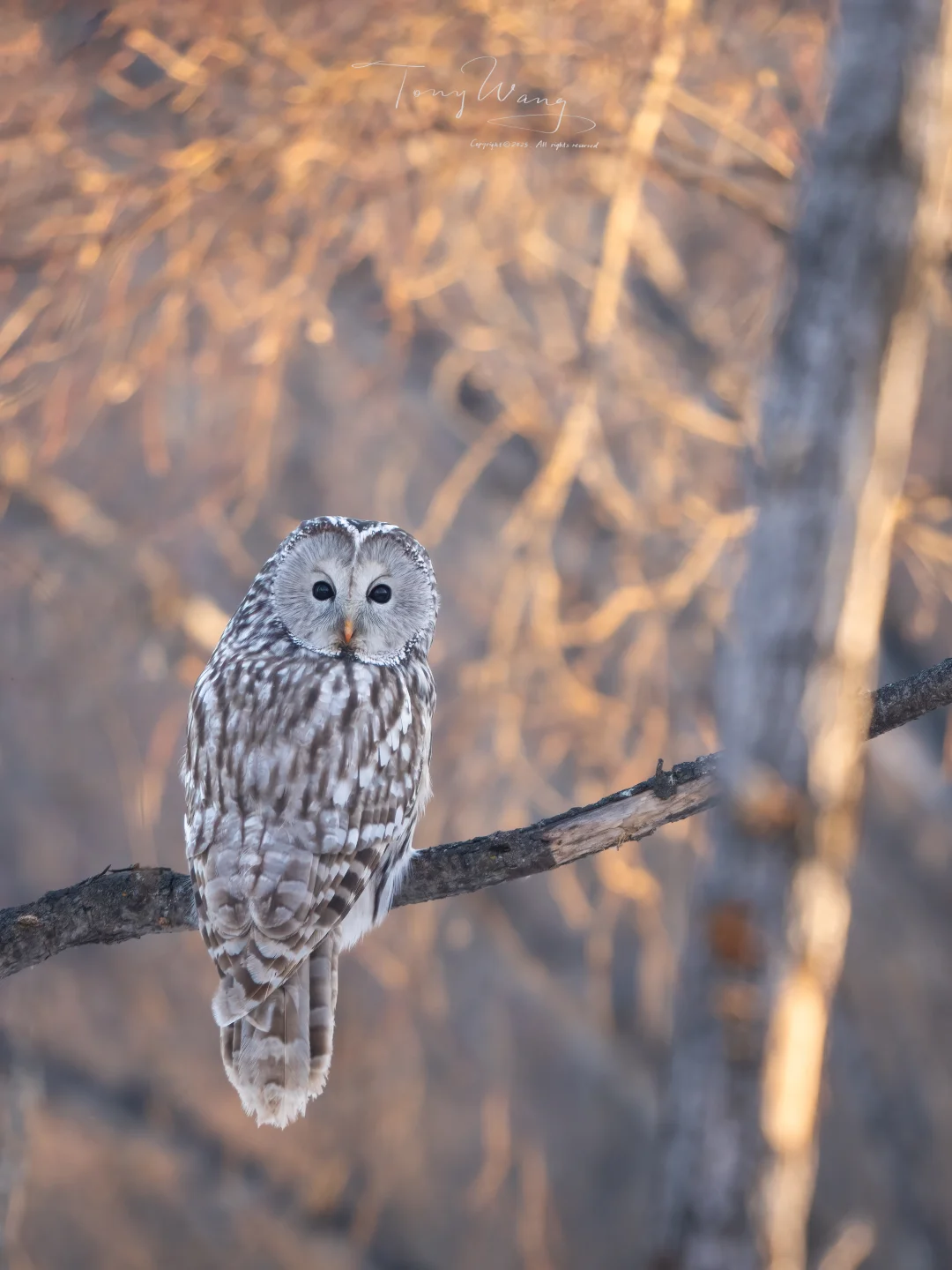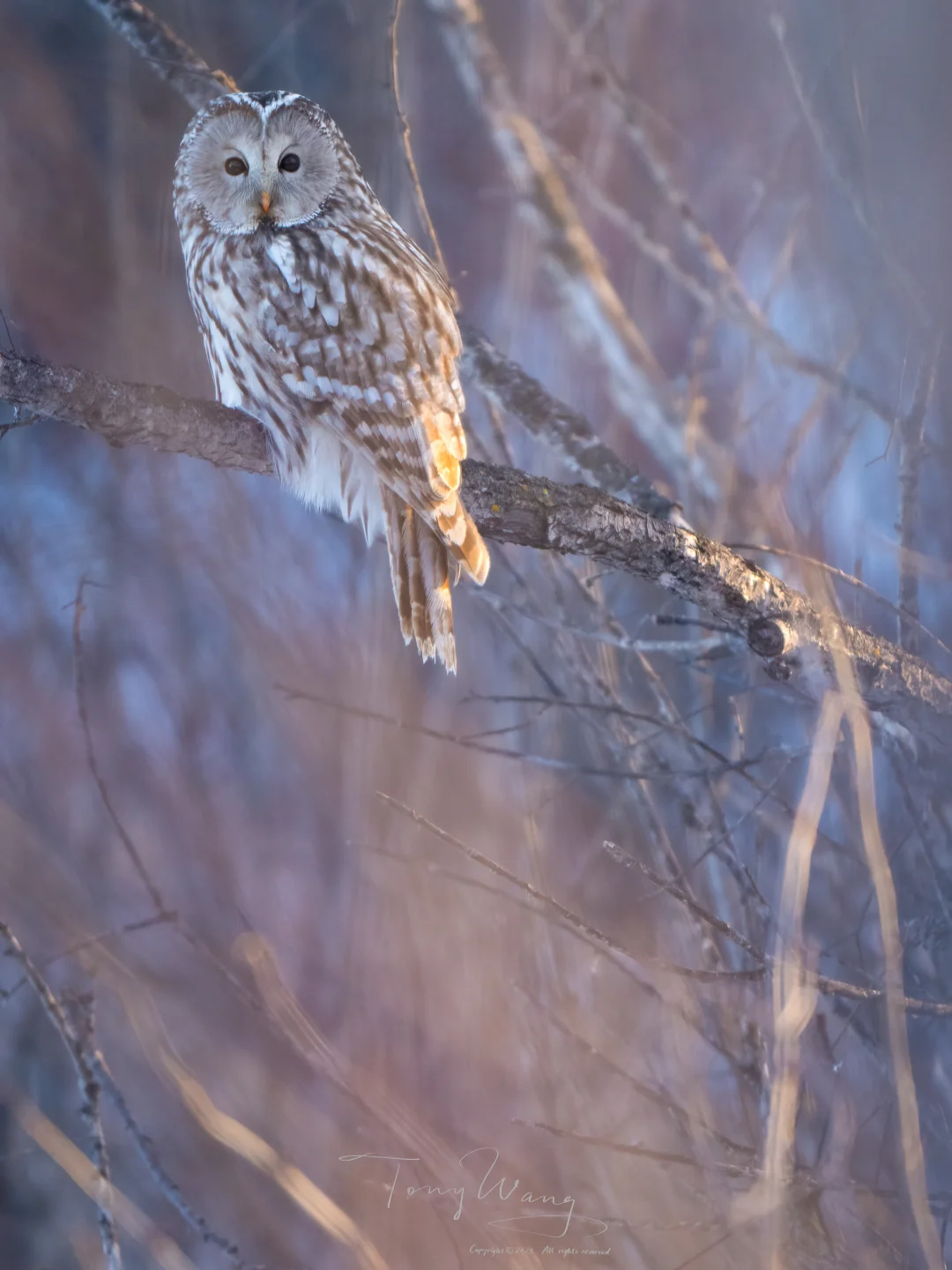 在呼伦贝尔森林的这个初冬午后,当斜阳以极低的角度穿透林窗,将整片空地浸染成蜂蜜色与绛紫色的混合体时,我们在车窗外看到了一只披上了金紫色光泽的长尾林鸮。