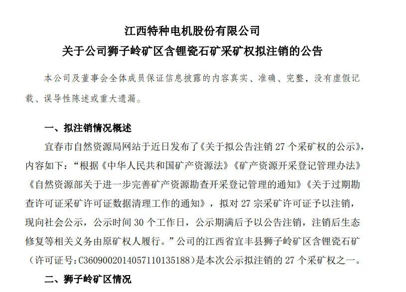 12月17日,江特电机公告称,公司已向宜春市自然资源局提交了《关于宜丰县狮子岭矿区含锂瓷石矿拟注销公示的异议申请》,提出相关解决方案,尽最大努力争取延续狮子岭矿区采矿证。
