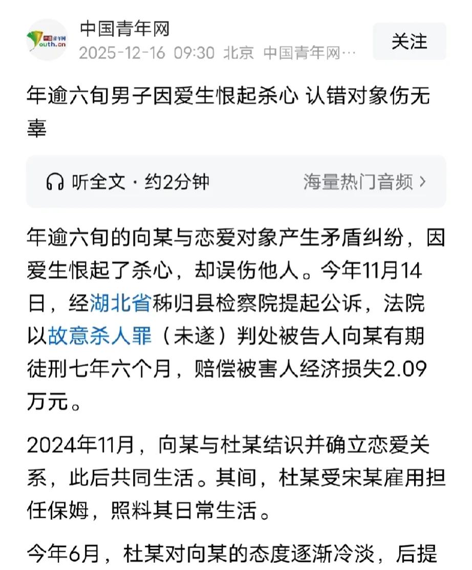 湖北秭归,60岁大爷跟女友恋爱,两人感情不错,可女友去给人家当保姆后,渐渐对大爷冷淡还提出分手,大爷怀疑女友跟雇主有染,气得带刀尾随,试图解决掉两人。女友发现后赶紧找雇主的房东求助,没想到,大爷误把房东当雇主,冲上去就往房东颈部多次捅刺,之后出逃,房东经抢救脱离危险。大爷最终被判有期徒刑7年6个月,并赔偿房东2.09万元。网友:这个处罚太轻了。 2024年11月份,60岁的向大爷经人介绍认识年龄相仿的杜大妈,两人都是单身。 向大爷对杜大妈的印象不错,之后就时不时约杜大妈出门散步,聊天,随着相处的时间渐长,两人对彼此产生了感情。 不久后,向大爷和杜大妈以男女朋友的身份恋爱交往。 向大爷很舍得为杜大妈花钱,因为他是奔着结婚而去的。 像他们这个年纪,不要求太多,只要两个人合得来,彼此相互照顾、互相关心,就满足了。 之后的交往,两个人的感情一直很稳定。 就在杜大妈和向大爷恋爱后不久,杜大妈想着趁自己还干得动,想多存点养老钱,于是托人帮忙找了一份干保姆的工作。 雇主家离向大爷家并不远,而且工资待遇也不错,杜大妈欣然接受。 雇主是一位姓宋的大爷,他平时为人和善,对杜大妈不错。 杜大妈自从去干保姆后,时间就变少了,陪伴向大爷的时间也变得越来越少,对此,向大爷很不满,两人之间开始出现矛盾。 因为两人之间矛盾不断,杜大妈对向大爷开始慢慢变得冷淡起来。 今年6月份的时候,杜大妈跟向大爷提出了分手,这可把向大爷急坏了,好好的一段感情,才去干保姆几个月怎么说变就变了。 向大爷觉得这肯定是跟雇主有关系,保不准,杜大妈和雇主宋大爷有染呢,想到这向大爷更加气,他觉得两人背叛了自己。 不久后,向大爷和杜大妈产生经济纠纷,两人闹到居委会,经过居委会调解也没能调解成功。 6月30号,向大爷又找到杜大妈,想解决他们之间的经济纠纷,两人说着说着又吵了起来,吵到最后发生肢体冲突,不过很快被人劝开了。 向大爷因此萌生了杀害杜大妈和宋大爷的念头,于是他在杜大妈去宋大爷家的路上偷偷尾随,途中还溜进一家便利店买了一把刀,随身带着。 杜大妈在回去途中回头时无意中望见了向大爷,她察觉出异样,赶紧赶回宋大爷家。 杜大妈进门后赶紧把门锁好,向大爷只能在门口蹲守。 杜大妈发现向大爷久久不肯离去,只好向宋大爷的房东乔某打电话求助。 乔某得知情况后,抗了一把锄头来到门口,询问向大爷的身份。 向大爷本就不认识宋大爷,他以为乔某是宋大爷,二话不说直接冲上去往乔某脖子上捅刺几刀。 干完这一切后,向大爷担心被抓,当场逃往附近的山林。 所幸的是,乔某被送医及时,经过医生抢救脱离了危险。 而向大爷很快被警方抓捕归案。 9月13号,秭归县公安局把这案子移交给了秭归县检察院。 检察院仔细调查了之后觉得,向某是因为感情上的事儿起了杀心,结果动手的时候认错了人,还拿刀往人家脖子这种要命的地方捅。 他的行为明显已经构成故意杀人罪了,不过因为被杀的不是他本来想杀的人,这属于是他自己意志以外的原因没把人弄死,得算犯罪未遂。 9月20号,秭归县检察院按照法律规定,以涉嫌故意杀人罪(未遂)把向某告到了法院。 11月14号,法院最终判决,向某犯故意杀人罪(未遂),判处他有期徒刑七年六个月,赔偿被害人2.09万元的经济损失。 对此,有人说,这判得也太轻了吧!拿着刀往人脖子上捅,还认错了人伤及无辜,这可是故意杀人啊!就判七年半? 还有那两万多赔偿,估计连人家的医药费都不够,更别说弥补人家受的惊吓和遭的罪了,这处罚实在让人没法接受! 那么,从法律角度如何分析? 1. 《刑法》第232条规定:故意杀人的,处死刑、无期徒刑或者十年以上有期徒刑;情节较轻的,处三年以上十年以下有期徒刑。 本案中,向某因感情纠纷预谋杀人,购买刀具后尾随目标,持刀捅刺他人颈部这一致命部位,主观上具有明确杀人故意,客观上实施了杀人行为,完全符合故意杀人罪的构成要件,本应在上述法定刑范围内量刑。 2. 《刑法》第23条规定:已经着手实行犯罪,由于犯罪分子意志以外的原因而未得逞的,是犯罪未遂。 对于未遂犯,可以比照既遂犯从轻或者减轻处罚。同时根据《刑事诉讼法》第101条规定,刑事附带民事诉讼赔偿仅限犯罪造成的直接物质损失。 本案中,向某因认错人未杀害原定目标,且被害人经抢救脱险,属于意志以外原因导致犯罪未得逞,构成未遂,法院据此从轻判处七年六个月有期徒刑。 2.09万元赔偿应是针对被害人医疗费、护理费等直接物质损失的认定,精神损害赔偿不在附带民事诉讼赔偿范围内,故未支持额外赔偿。 最后,感情的散场本该体面放手,向某因一己执念持刀伤人,伤及无辜更是错上加错。 法律的判决兼顾了事实与规则,也警醒着所有人:冲动之下的恶行,终将付出沉重代价。 关注@猫眼学法 品读案例故事,学习法律经验