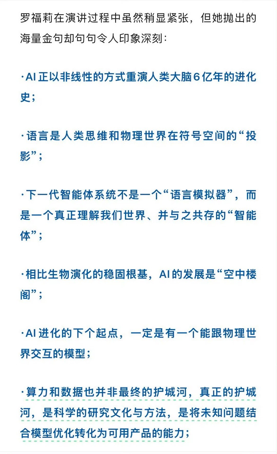 小米天才少女罗福莉首次登场看看罗福莉这几句金句,真的太顶了!特别是关于“护城河”的理解:算力和数据都不是终点,科学的研究文化与方法才是!这一波认知直接在大气层!而且那个关于“物理世界交互”的观点,完美解释了为什么小米要死磕汽车和机器人。不仅仅是造个硬件,这是在为AI进化搭建真正的舞台啊!“下一代智能体系统不是一个语言模拟器,而是真正理解我们世界、并与之共存的智能体”!