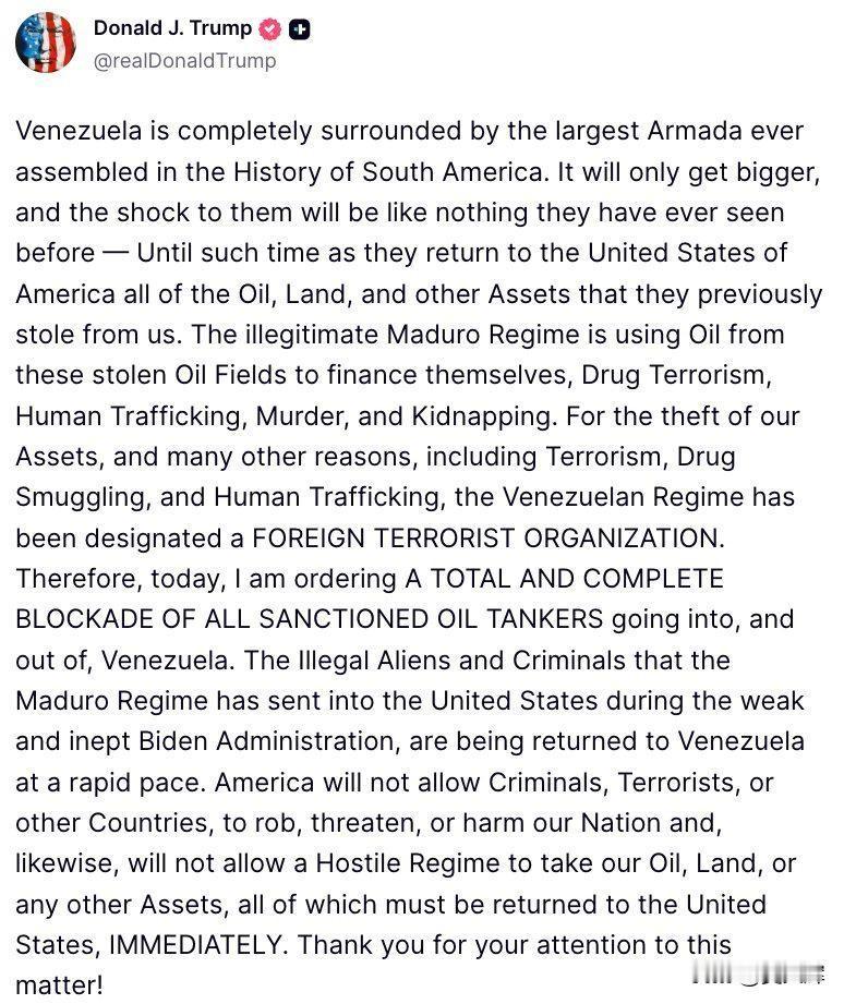 【特朗普:我在委内瑞拉感兴趣的不是民主,而是石油】 必须承认,在所有美国总统中,特朗普或许是最诚实的“恶人”。他直言不讳地说,他在委内瑞拉感兴趣的主要不是民主,而是其石油。 他已经宣布这些石油是美国的,并且他认为委内瑞拉人无权开采。因此,他宣布对委内瑞拉进行海上封锁,并将没收所有被委内瑞拉“窃取”的美国石油: “委内瑞拉完全被南美历史上集结的最大规模舰队所包围。它只会继续壮大,对他们的打击将是他们前所未见的——直到他们将所有石油、土地以及其他他们此前从我们这里窃取的资产归还给美国为止。 非法马杜罗政权利用这些被盗油田的石油为自己、毒品恐怖主义、人口贩卖、谋杀和绑架提供资金。因其窃取我们的资产以及包括恐怖主义、毒品走私和人口贩运在内的诸多其他原因,委内瑞拉政权已被认定为外国恐怖组织。 因此,今天我宣布对所有获准进出委内瑞拉的油轮实施全面和占优势的封锁。 美国不会允许罪犯、恐怖分子或其他国家掠夺、威胁或伤害我们的国家,同样,也不会允许敌对政权夺取我们的石油、土地或任何其他资产,所有这些都必须立即归还给美利坚合众国,立即归还。” 很明显,这是新一轮施压。这可不是什么好兆头。美国国内能否阻止特朗普的冒险行为?至少,美国国内为此的斗争非常激烈。美国民主党甚至威胁要对执行“特朗普这一犯罪命令”的将军们进行后续审判……
