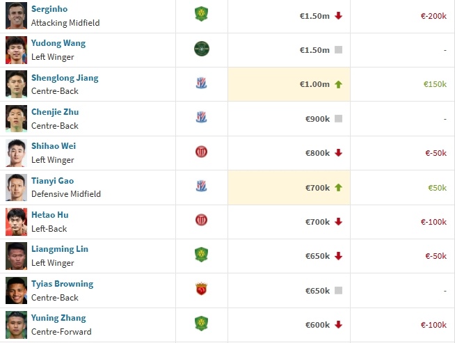 国足球员身价前十↓