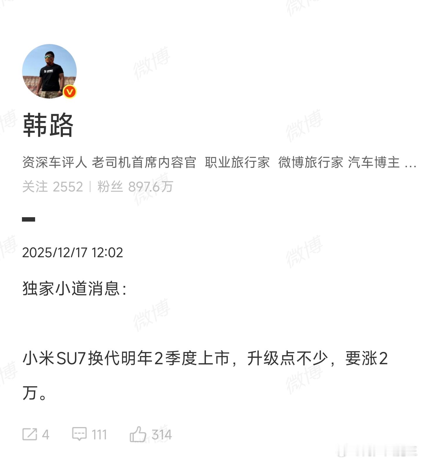 小米 SU7 换代或涨价 2 万元小米新一代 SU7 明年二季度上市 小米 SU7 换代消息来了!上市快两年仍稳坐 20 万 + 轿车销冠,2025 累计销量 24.7 万辆太能打~ 曝光的电气架构、智驾升级诚意足,涨价或因碳酸锂等原材料暴涨,也算合理。但现款更香啊!下定 7 周提车,部分车型年内能提,还能蹭购置税补贴,春节开新车不香吗?新一代二季度上市,流程跑下来提车大概率要等,还得多花 2 万。买车纠结党直接看需求:早享受选现款,追新升级等换代,销冠兜底闭眼冲不踩雷~ 你会等新车还是抄底现款?