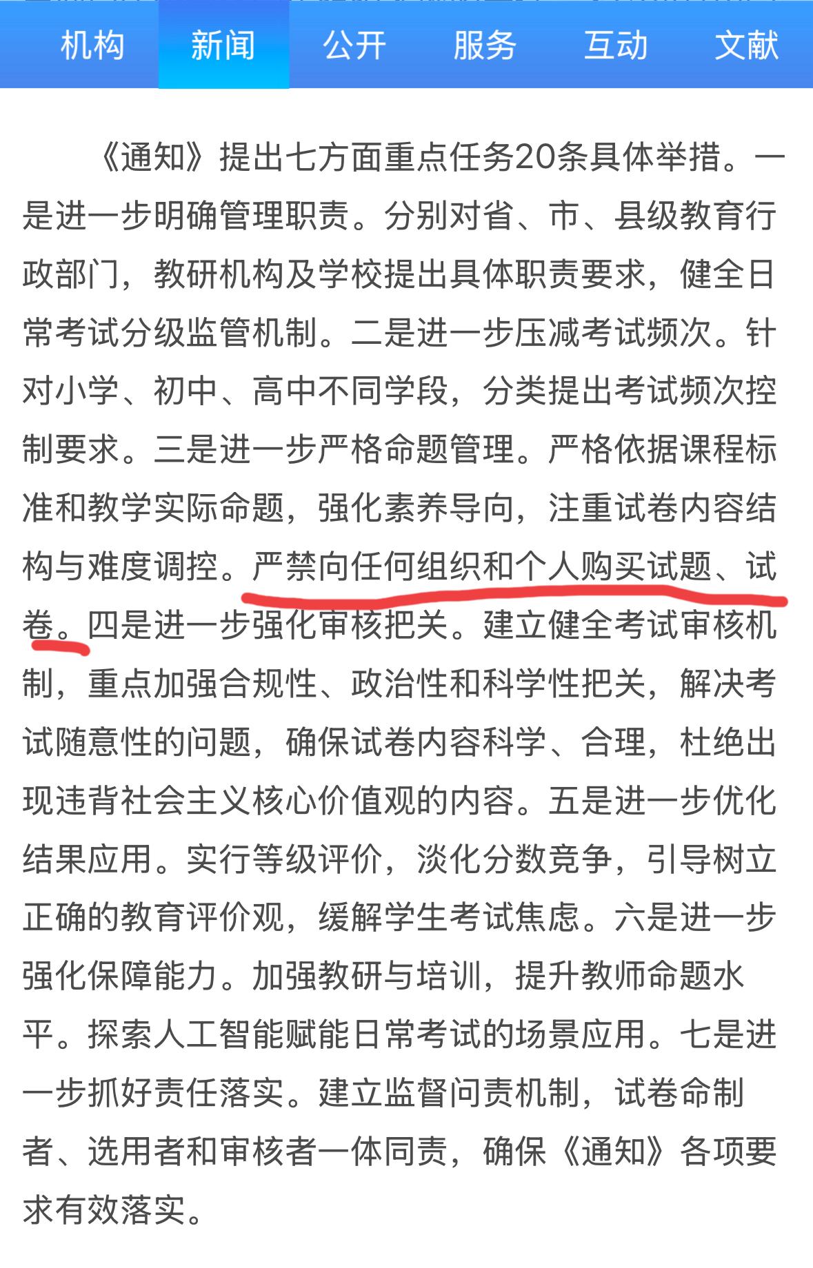 根据教育部最新通知,这些人要失业了! 就在今天,教育部印发了《关于进一步加强中小学日常考试管理的通知》。其中有一条明确指出:严谨向任何组织和个人购买试题、试卷。这意味着一些靠卖试卷、试题为生的名师、名家将要失业了。 《通知》还规定了,要严格控制中小学考试次数,提高考试质量,淡化分数,利用等级进行评价。同时鼓励利用人工AI进行场景应用。培训提高教师出题素养,主要还是要靠教师出题。最终一个目的就是给学生减负,还是为这样子的政策点赞。