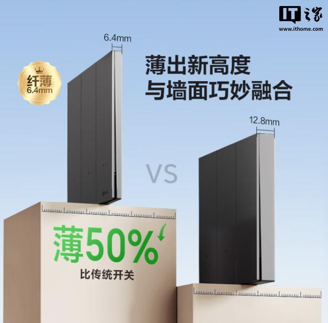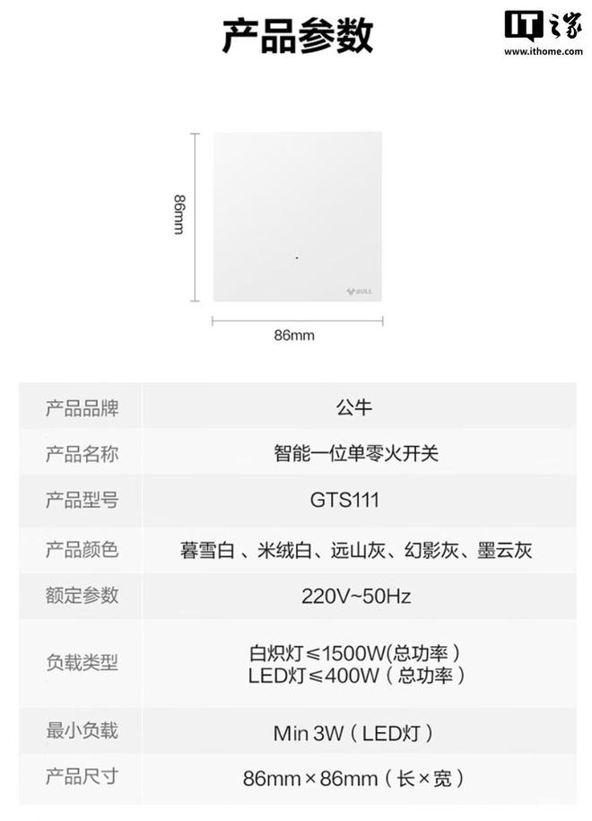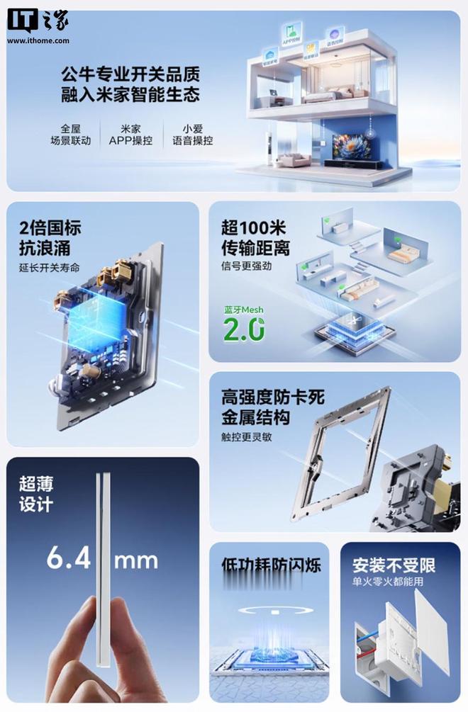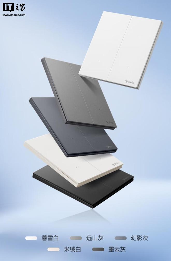 公牛灵犀智能开关支持米家App远程控制、小爱语音控制;厚度6.4mm,采用钢材固定架,可选五种配色。