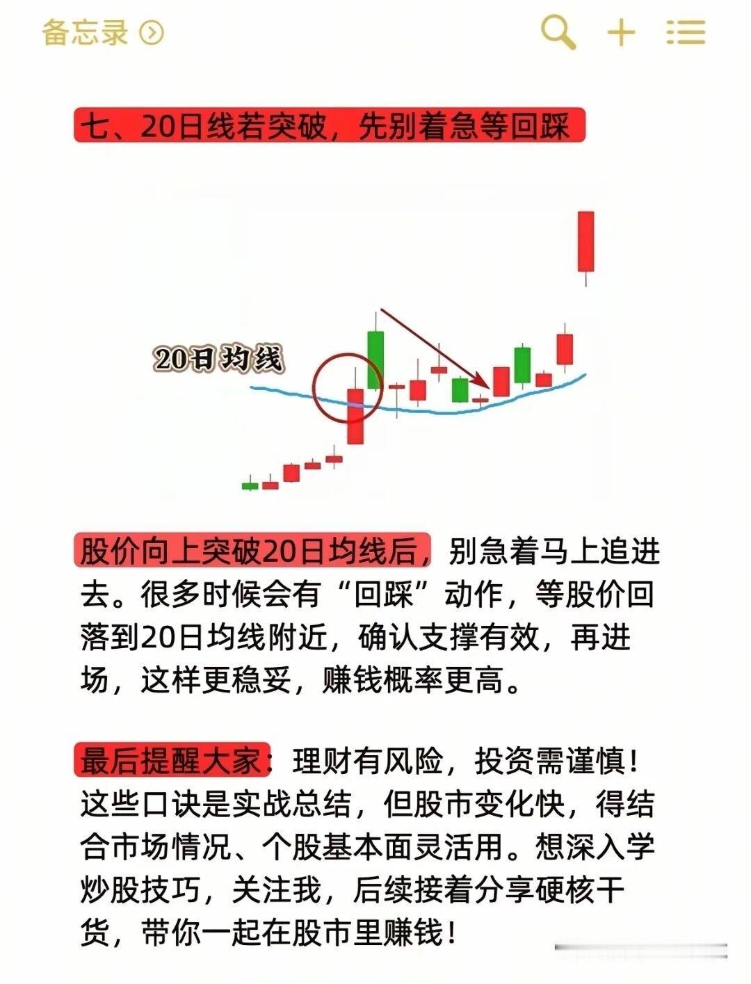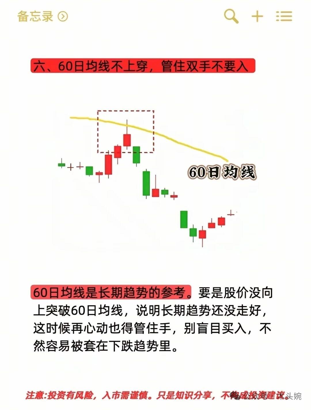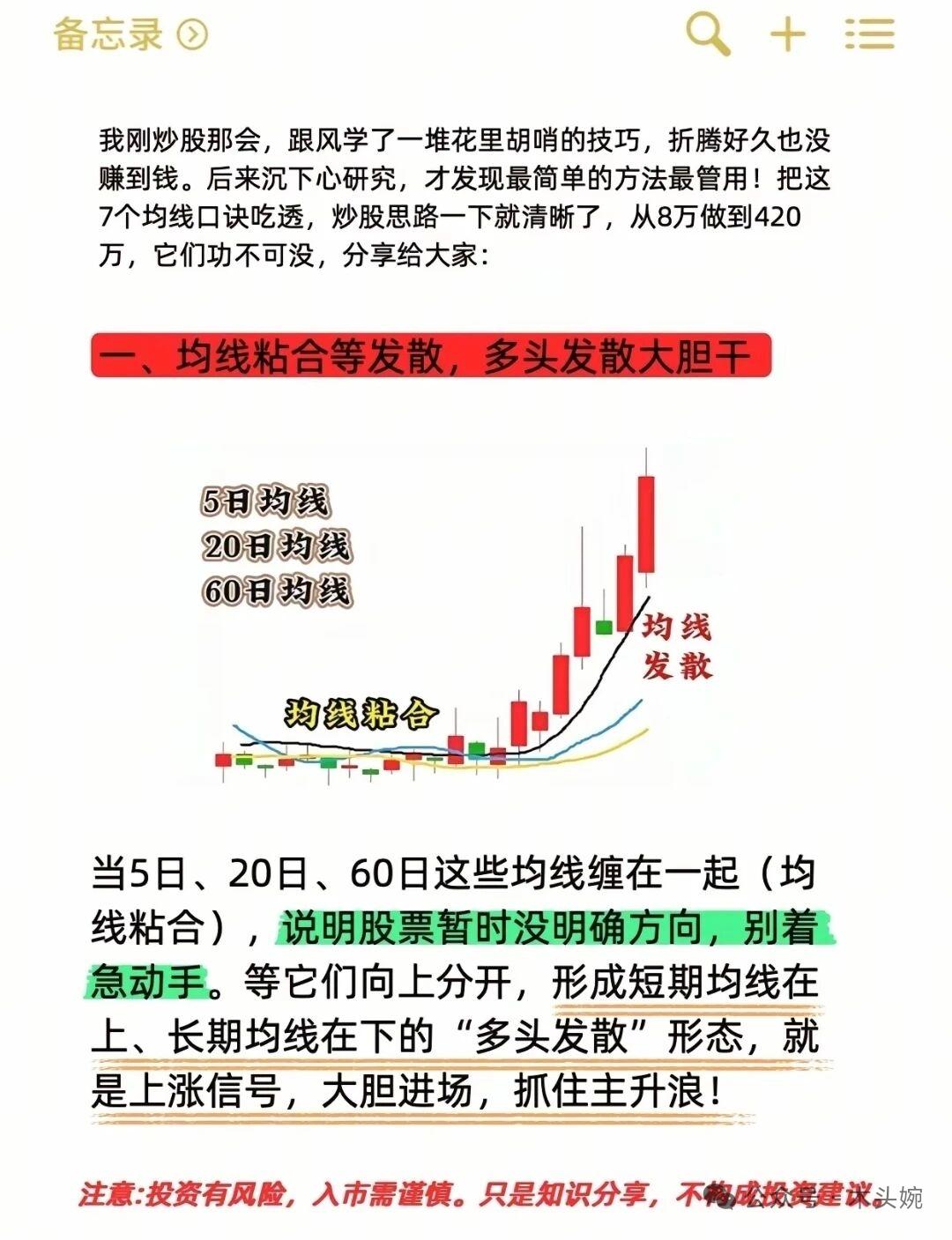 炒股老亏钱怎么办?一定要学习前人的经验和技术,不要让自己的辛苦钱去交无用的学费!!炒股总踩坑?这7个均线口诀和8条实用经验帮你理清思路! 均线口诀:均线粘合等发散,多头发散大胆干;20日线止跌看反弹,放量阴要跑、缩量阴敢加;5日线不破拿稳,60日线上穿再进场,突破20日线等回踩更稳妥。 简单实用的均线技巧,看懂少走3年弯路,建议收藏慢慢看~ (理财有风险入市需谨慎,资料取材网络仅供参考,不能完全套用)炒股经验 股票投资小技巧 炒股炒股技巧 股市避坑小技巧 股市交易技巧 股票交易思路