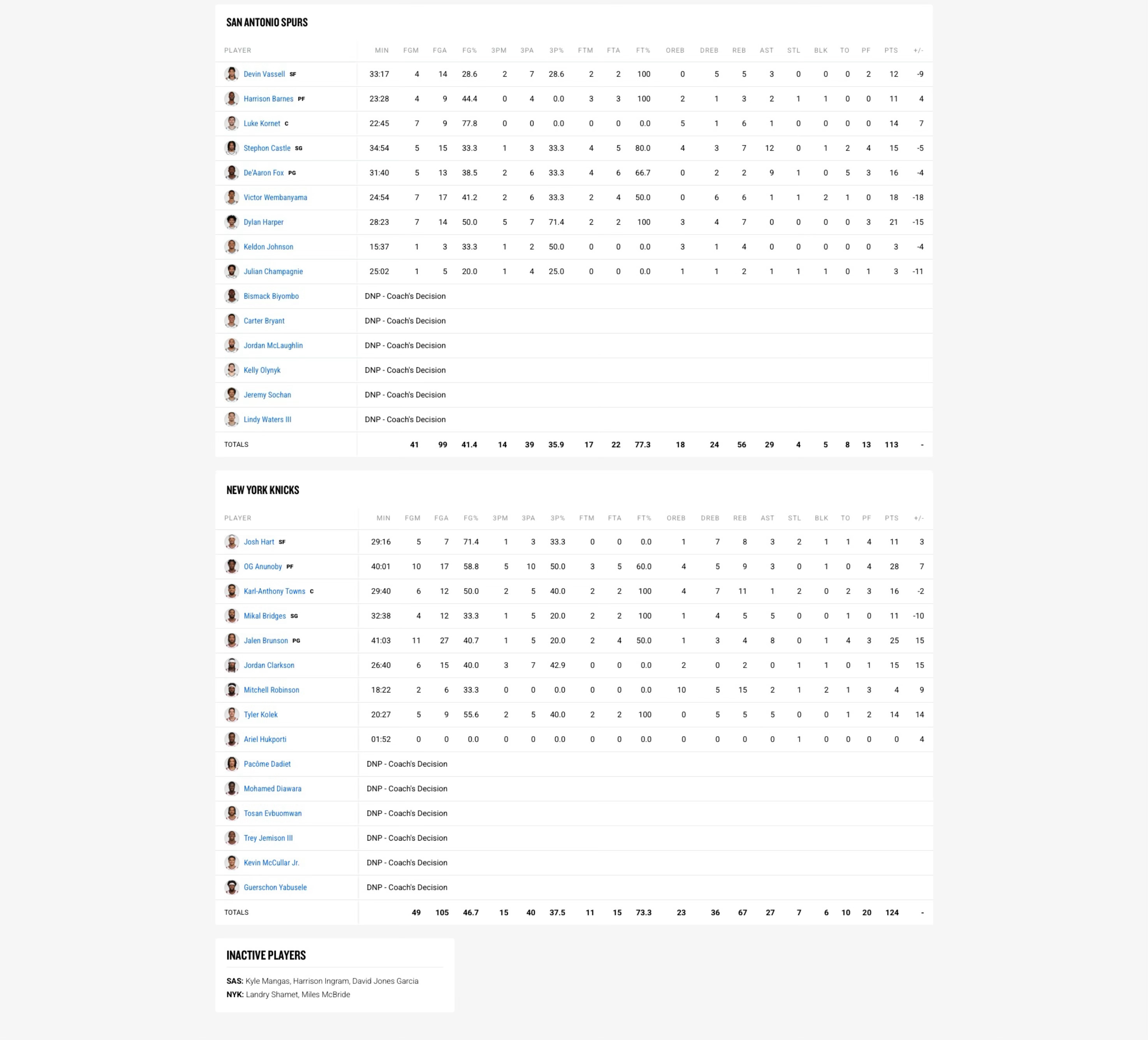 全场比赛结束!马刺末节崩盘113-124不敌尼克斯,无缘NBA杯赛冠军马刺:哈珀21分7板、文班亚马18分6板1助2帽、福克斯16分2板9助、卡斯尔15分7板12助、科内特14分6板1助、瓦塞尔12分5板3助、巴恩斯11分3板2助、凯尔登3分4板、尚帕尼3分2板1助尼克斯:阿努诺比28分9板3助、布伦森25分4板8助2帽、唐斯16分11板1助2断、克拉克森15分2板、科勒克14分5板5助、哈特11分8板3助2断、布里奇斯11分5板5助、罗宾逊4分15板2助2帽。马刺下一场将在12月19日主场迎战奇才超话创作官 |尼克斯夺NBA杯总冠军|马刺vs尼克斯