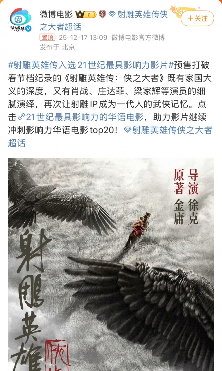 直播吧12月17日讯今日预售打破春节档纪录的《射雕英雄传:侠之大者》入选21世纪最具影响力影片,将冲击华语电影Top20。