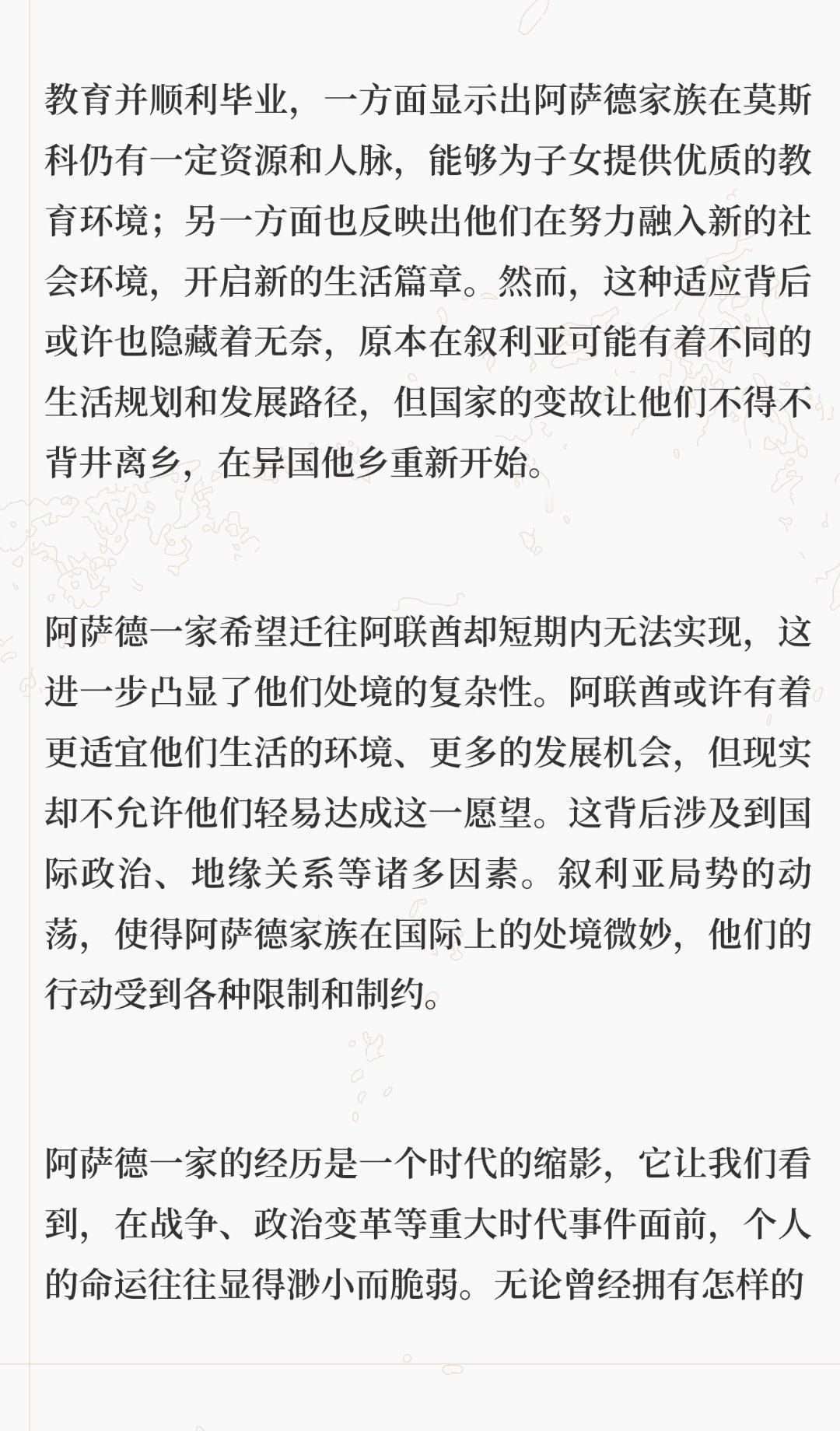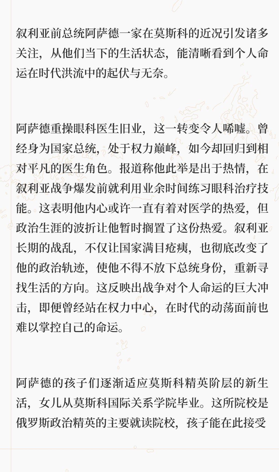 | 叙利亚前总统阿萨德一家在莫斯科的近况引发诸多关注。阿萨德重操眼科医生旧业,这一转变令人唏嘘。曾经身为国家总统,处于权力巅峰,如今却回归到相对平凡的医生角色。报道称他此举是出于热情,在叙利亚战争爆发前就利用业余时间练习眼科治疗技能。这表明他内心或许一直有着对医学的热爱,但政治生涯的波折让他暂时搁置了这份热爱。叙利亚长期的战乱,不仅让国家满目疮痍,也彻底改变了他的政治轨迹,使他不得不放下总统身份,重新寻找生活的方向。这反映出战争对个人命运的巨大冲击,即便曾经站在权力中心,在时代的动荡面前也难以掌控自己的命运。阿萨德的孩子们逐渐适应莫斯科精英阶层的新生活,女儿从莫斯科国际关系学院毕业。这所院校是俄罗斯政治精英的主要就读院校,孩子能在此接受教育并顺利毕业,一方面显示出阿萨德家族在莫斯科仍有一定资源和人脉,能够为子女提供优质的教育环境;另一方面也反映出他们在努力融入新的社会环境,开启新的生活篇章。然而,这种适应背后或许也隐藏着无奈,原本在叙利亚可能有着不同的生活规划和发展路径,但国家的变故让他们不得不背井离乡,在异国他乡重新开始。阿萨德一家希望迁往阿联酋却短期内无法实现,这进一步凸显了他们处境的复杂性。阿联酋或许有着更适宜他们生活的环境、更多的发展机会,但现实却不允许他们轻易达成这一愿望。这背后涉及到国际政治、地缘关系等诸多因素。叙利亚局势的动荡,使得阿萨德家族在国际上的处境微妙,他们的行动受到各种限制和制约。阿萨德一家的经历是一个时代的缩影,它让我们看到,在战争、政治变革等重大时代事件面前,个人的命运往往显得渺小而脆弱。无论曾经拥有怎样的地位和财富,都可能在一夜之间发生翻天覆地的变化。这也提醒我们,和平与稳定对于一个国家和个人来说是多么珍贵,只有生活在一个和平稳定的环境中,人们才能更好地掌控自己的命运,追求自己的梦想。