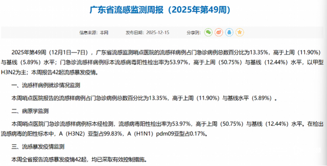 《广东省流感监测周报(2025年第49周)》显示,2025年第49周(12月1日—7日),广东省流感监测哨点医院的流感样病例占门急诊病例总数百分比为13.35%,高于上周(11.90%)与基线(5.89%)水平;门急诊流感样病例标本流感病毒阳性检出率为53.97%,高于上周(50.75%)与基线(12.44%)水平,以甲型H3N2为主;本周报告42起流感暴发疫情。