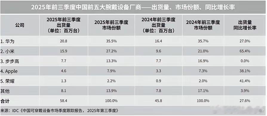 IDC:2025年前三季度全球腕戴设备市场出货1.5亿台,同比增长10.0%。其中,中国市场累计出货量为5,843万台,同比增长27.6%。前三季度,华为以2860万出货量,位居全球腕戴设备出货量第一的位置