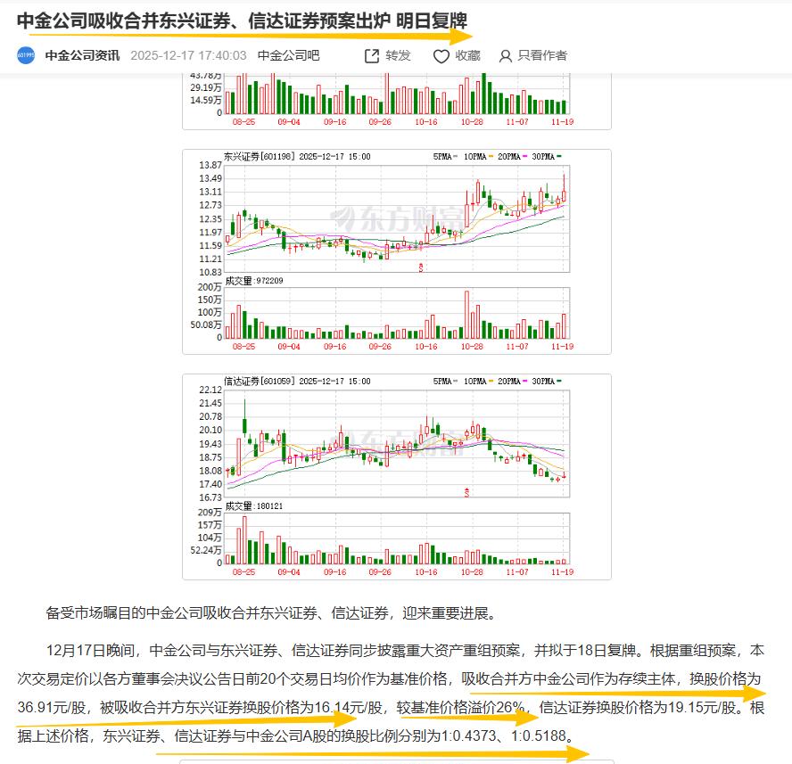 “航母级券商”明日复牌啦,会怎么走呢?券商会因此“东风”吹响“旗手”号角呢? 近一个月的等待,时间过得真快呀,期待“信达”不负我望。 重组预案,溢价换股:中金作为存续主体,换股价格为36.91元/股,停牌前34.89元;东兴较基准价格溢价26%,按19.14元换股,其停牌前为13.13元;信达停牌前17.79元,按19.15元换股。 当初国泰和海通重组时,重组预案公布的换股价为13.83元,低于停牌前的14.70元;2024年10月10日复牌后,股价最高涨至21.10元。收起