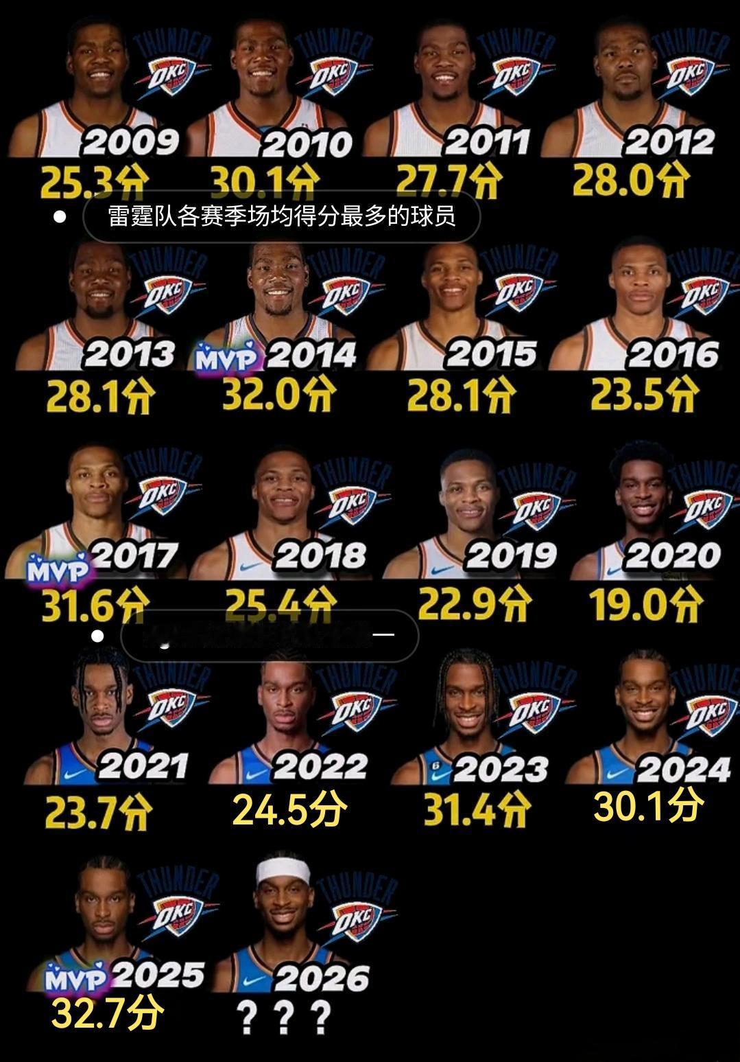 现在亚历山大已经超越雷霆三少在雷霆的地位了吧,连续3个赛季场均得分30+,加上新赛季,那就是连续4个赛季场均得分30+。 2014年以前,雷霆得分王是杜兰特,杜兰特在雷霆连续拿了6个队内得分王,其中2个赛季拿到30+得分,并拿到了1次MVP。 威少从2015年开始接管雷霆得分王,之后拿到了5次队内得分王,其中1个赛季拿到30+得分,并拿到了1次MVP。 亚历山大从2020年开始接管雷霆得分王,之后拿到了6次队内得分王,加上新赛季那就是7次,其中3个赛季拿到30+得分,加上新赛季那就是4个赛季,并拿到了1次MVP。