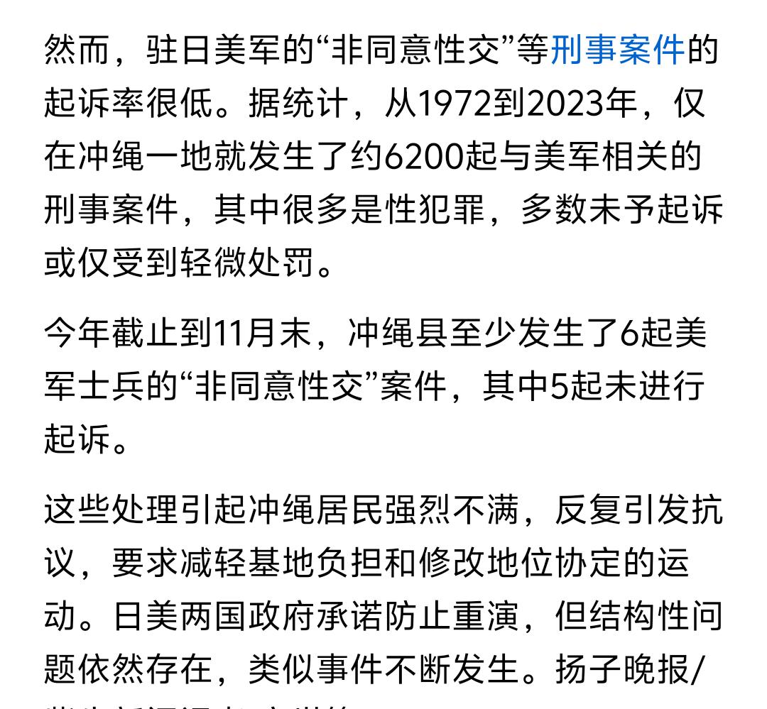 日本人真是脑洞大开,竟然把强奸说成是非同意性性交,只因犯罪者是驻日美军。 根据日本媒体报道,在日本冲绳发生了多起驻日美军强奸当地女性的案件,但是冲绳警方因为强奸犯是美国大兵,美化了这种行为,把这种行为说成是非同意性性交,并且做出了不起诉的决定,引发了当地民众的不满。 根据统计,驻日美军发生了6000多起刑事案件,其中很多都是强奸罪,但大多都没有被起诉,或者处罚很轻。 日本的纵容,让驻日美军在冲绳无恶不作,而在日本,美国人似乎就是皇帝。为了讨好美国,日本人把自己的奴性发挥到了极致。