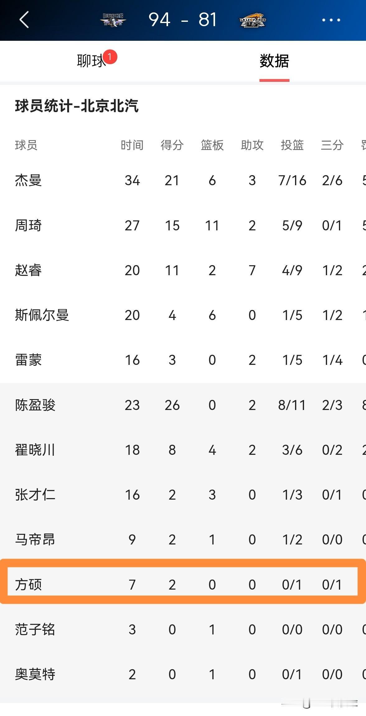 北京北汽老将方硕彻底的沦为了陪衬!在今天北京北汽主场以94:81战胜辽宁本钢的比